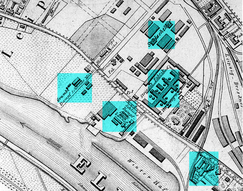 Das 1863 von Ernst Otto Schlick gegründete Unternehmen ging 1872 an eine Aktiengesellschaft über und firmierte fortan als „Sächsische Dampfschiffs- und Maschinenbau-Anstalt“. Durch den Ankauf von Nachbargrundstücken sowie den Bau neuer Werkstätten vergrößerte sich das Areal des Unternehmens beträchtlich. 1884 wurde es von der „Österreichischen Nordwest Dampfschiffahrtsgesellschaft“ übernommen und 1899 in „Dresdener Maschinenbau & Schiffswerft AG Dresden-Neustadt“ umfirmiert. Nach der zum 1. Januar 1904 erfolgten Fusion mit der Übigauer Schiffswerft zur „Dresdner Maschinenfabrik und Schiffswerft Übigau“ AG wurde der Schiffbau in der Leipziger Vorstadt eingestellt und nach Übigau verlegt.
