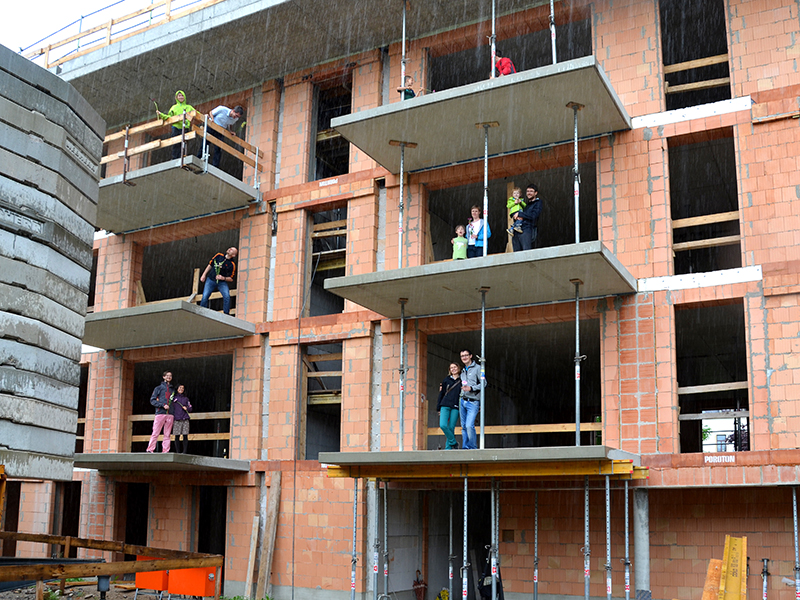 „Im Sommer bei Sonnenuntergang hier oben sitzen mit ‘nem kühlen Getränk, das wär’s!“ Sehnsüchtig-zustimmendes Grinsen in allen Gesichtern. „Vielleicht sollten wir den Aufzugschacht noch eine Etage aufstocken“, scherzt einer aus der Runde. Denen da in luftiger Höhe ihre Phantasie durchgeht, sind die Bauherren des Neubaus an der Konkordienstraße 24. Vom „Deckel“ ihres zukünftigen Hauses aus genießen sie die beeindruckende Aussicht über Pieschens Dächer und träumen sich einige Monate in die Zukunft. Im Dezember wollen die ersten Familien einziehen. Wenn der Bau weiter gut läuft.