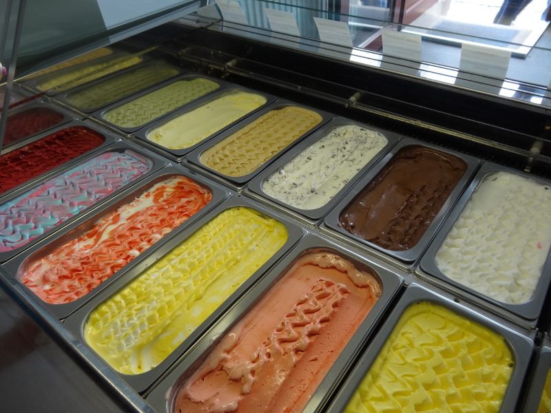 Kurz nach der Eröffnung sind die meisten der zwölf Eisbehälter noch unberührt. Bei Quark-Blutorange und zwei weiteren Sorten allerdings ist das dekorative Muster nicht mehr ganz vollständig, denn die ersten Kunden haben das Geschäft schon entdeckt und bei Hannelore ein Eis geordert. Kollegin Doreen hat bereits eine Eisschokolade verkauft.