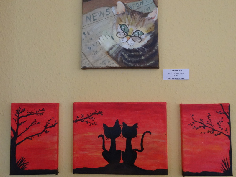 Erstmals gibt es Porträts zu sehen, aber auch Landschaften und Katzenbilder. Etwas ausgefallener sind die bemalten Schallplatten.“Acryl auf Vinyl“ nennt Gerda Kočí ihre runden Kunstwerke. Schaut man auf die Rückseite, entdeckt man das Logo von Eterna oder Amiga. Mit einer heißen Nadel brennt sie das kleine Loch zum Aufhängen in die Schallplatte.