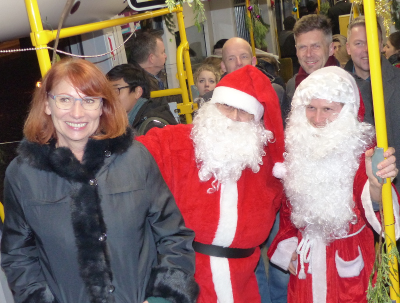 Ungewohnter Betrieb herrschte gestern Abend im Straßenbahnhof und später auch im Emmers. Fast 200 Fahrgäste, je zur Hälfte Dresdner Einwohner und Studenten aus verschiedensten Nationen waren nach einer Begegnungsfahrt mit der X-Mas Tram hier gelandet. Hinter sich hatten sie eine Tour durch das weihnachtliche Dresden mit Start an der Gleisschleife Nöthnitzer Straße. „Die X-Mas Tram ermöglicht auf elegante Weise interkulturelle Begegnungen und hat sich zu einem kleinen Juwel entwickelt“, freut sich Initiator Bert Siegel. „Unsere Paten haben wieder eine große Fülle an Angeboten auf die Beine gestellt, so dass wirklich kein ausländischer Student Weihnachten allein feiern muss“, erklärte er das Ziel der Aktion.
