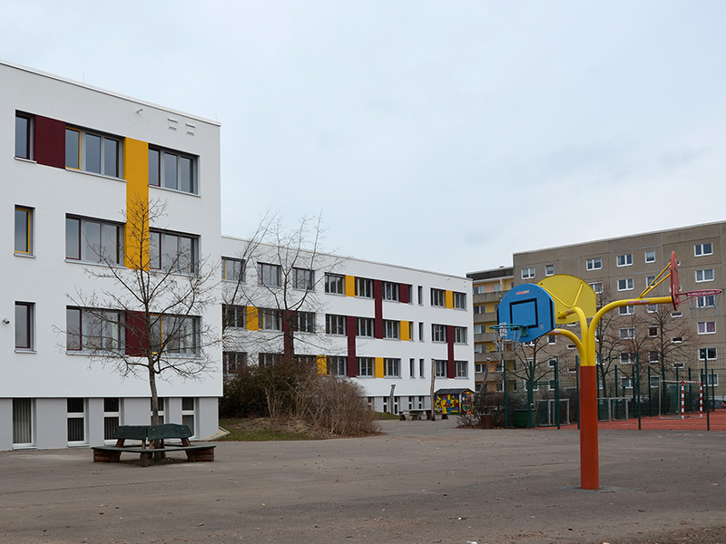 Zweitens wegen des Baustein-Systems: Vier Gebäudeteile sind so an- und ineinandergeschoben, dass möglichst viel Licht die Räume erreicht, aber wenig Heizenergie verloren geht. Bei der neuen „Schulbaureihe 80“ gelangte man von einem zentralen Gebäudeteil in die „Bausteine“ für die Klassen 1 bis 4, für die fünften bis zehnten Klassen sowie in die Turnhalle. „Der Grundgedanke dieser Schule ist super“, findet Schulleiterin Stein, die übrigens nahezu seit der Eröffnung in der „9.“ unterrichtet. „Im kleinen Block die Kleinen, im großen die Großen. Außerdem sind die Klassenzimmer hell und die Gänge breit.“ Diese Vorzüge schätzten auch die Verantwortlichen zu DDR-Zeiten – weitere Schulen dieses Typs wurden Ende der 1980er noch in Berlin-Hellersdorf, in Neubrandenburg und an der Erdgas-Trasse in der Sowjetunion gebaut.