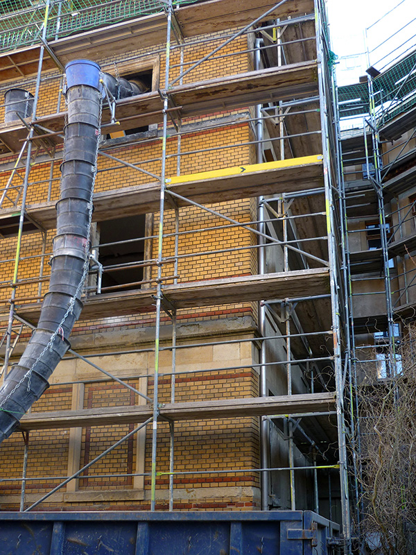 Die Wohnungen werden eine gehobene Ausstattung aufweisen, beispielsweise über eine Fußbodenheizung verfügen. Pro Etage erhalten zwei Wohnungen einen kleinen Balkon zum Mini-Innenhof. Zudem bekommt das viergeschossige Haus einen Aufzug. Das Dach mit dem kleinen Türmchen an der Stirnseite wird erneuert und die Fassade vom Dreck der vergangenen Jahrzehnte befreit, sodass die Klinker wieder in gelb und rot leuchten. Voraussichtlich im Herbst soll die Sanierung abgeschlossen sein. Dann wären die Arbeiten in einem knappen Jahr über die Bühne gegangen – im November 2016 hatte nämlich die Entkernung begonnen.