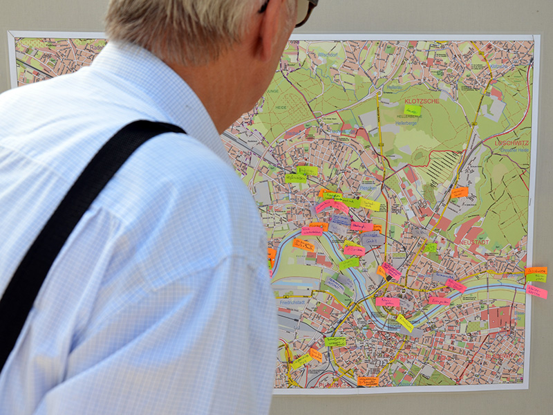 Mit bunten Fähnchen konnten Besucher diese Orte auf einer Dresden-Karte markieren. „Dabei haben wir keine großen Überraschungen erlebt“, schätzte Hoffmann ein. Das Zentralwerk sei mehrfach vorgekommen, ebenso Geh8, die Molenbrücke und die Elbwiesen. „Für uns ist das eine Bestandsaufnahme, denn die kulturellen Leuchttürme kennen wir, aber in der Kulturhauptstadt-Bewerbung sollen eben auch diese anderen Orte vorkommen, die den Menschen wichtig sind.“ Insofern sei die Bewerbung auch ein Mittel, um die Kultur des Miteinanders in der Stadt zu beleben.