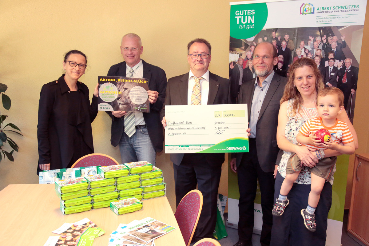Insgesamt fünf Dresdner Einrichtungen profitieren von einer Idee der Drewag-Vertriebsexperten. Die Kundenberater hatten bei ihren Firmen um Vorschläge für die Empfänger der fünf Drewag-Spendenpakete gebeten. „Ich finde es toll, wenn Dresdner die Dresdner unterstützen“, sagte Drewag-Kundenbetreuer Hagen Bode. Er hatte Peter Galow von der Dekra mitgebracht. Von dort kam der Vorschlag, ein Spendenpaket an die Albert-Schweitzer-Kinderdörfer zu überreichen. Eines der Kinderdorf-Häuser in Dresden steht in der Overbeckstraße in Übigau, ein weiteres in Lockwitz. Für das dritte wurde im April in der Travemünder Straße in Klotzsche der Grundstein gelegt. Dort soll Anfang 2018 die nächste Kinderdorf-Familie einziehen. „Wir suchen noch Bewerber“, sagte Frank Richter, Vorsitzender des Sächsischen Vereins der Albert-Schweitzer-Kinderdörfer. Sollte sich keine Familie finden, werde man dort zunächst mit einer Wohngruppe starten. Der Unterschied zur Familie bestehe darin, dass bis zu 7 Kinder von einem Erzieherteam betreut würden.