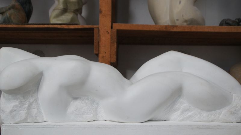 In der Bildhauer-Werkstatt stehen auf Arbeitsflächen und Sockeln Skulpturen in unterschiedlichen Stadien, an denen Feindt-Eißner zeitgleich arbeitet. Stagniert der Arbeitsfluss an der einen, wechselt sie zur anderen Figur. Manche warten jahrelang auf ihre Vollendung. Eines Tages findet Feindt-Eißner den richtigen Ansatz zur Weiterarbeit. „Das kommt ganz plötzlich“, sagt sie. Dann wird die Geschichte des Steines unter ihren Händen weitergeschrieben.