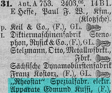 Seit 1906 auf der Werderstraße in der Dresdner-Südvorstadt ansässig, wurde der in der Nähe von Pilsen geborene Edmund Kussi (1866-1935) in den Adressbüchern als „Alleinvertrieb /Generalvertrieb des Staubsaugeapparates ‚Atom‘ für Sachsen und Thüringen“ geführt. Fünf Jahre später, im August 1911, gründeten er und die in Dresden wohnhaften Brüder, die Ingenieure Johann und Friedrich Cruse, im Hause Freiberger Straße Nr. 75 die Firma „RHEOSTAT- Specialfabrik elektrischer Apparate Edmund Kussi“. (Rheostat = stufenlos einstellbarer elektrischer Widerstand, erfunden 1840 vom britischen Physiker Charles Wheatstone (1802-1875)