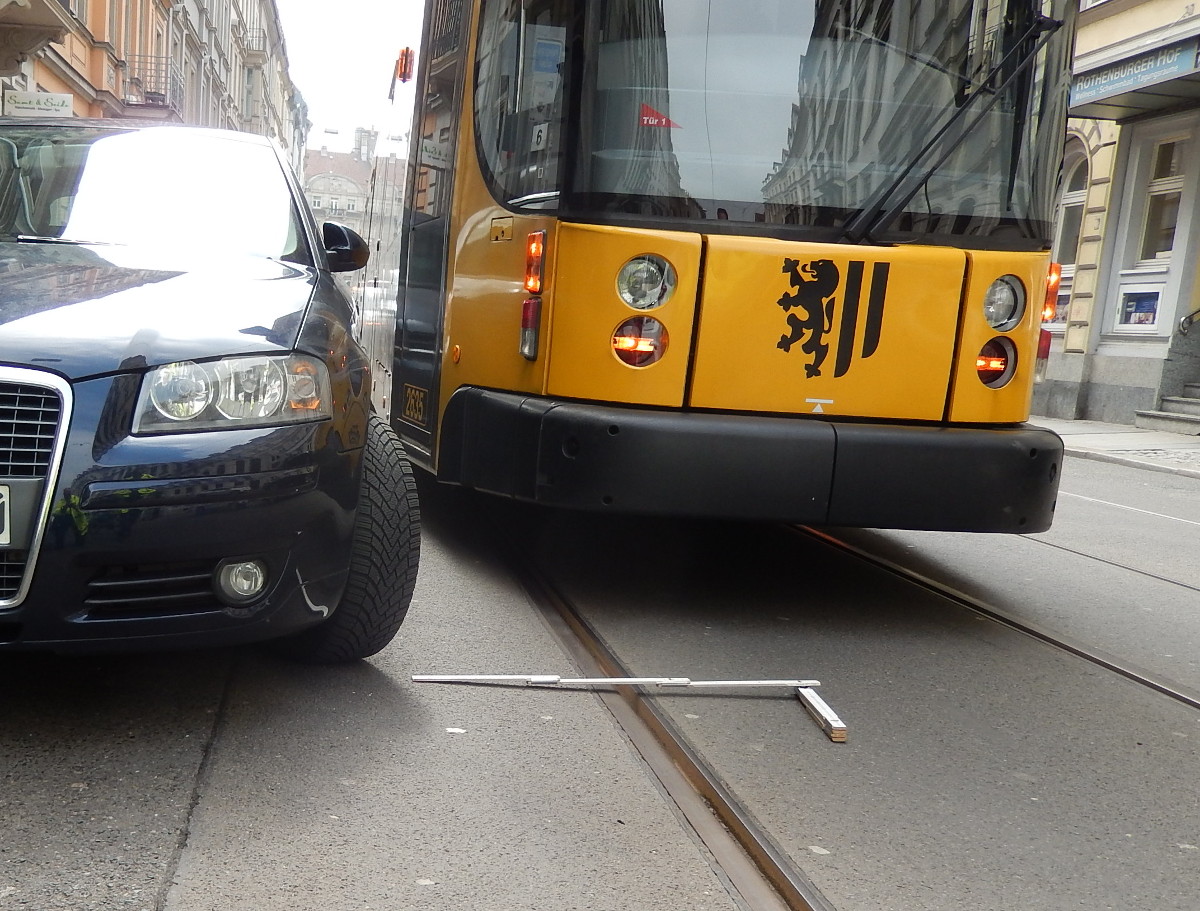„Im gesamten Stadtgebiet hat es im vergangenen Jahr 340 Störungen durch Falschparker gegeben“, nennt DVB-Sprecher Falk Lösch eine konkrete Zahl. Klarer Schwerpunkt sei mit etwa 70 Fällen die Görlitzer Straße in der Dresdner Neustadt. Dort ist die Linie 13 zwischen Mickten und Prohlis betroffen. Auch im Ortsamt Pieschen kennt Pinter weitere Schwachpunkte und nennt die Bürgerstraße als Beispiel. Hier seien es vor allem die Autofahrer, die nicht ordentlich einparken und weit ab vom Bordstein stehen. Zwischen dem Außenspiegel des Autos und dem Gleis müssen 60 Zentimeter Platz sein, damit die Straßenbahn ohne Probleme passieren könne, nennt Pinter einen Mindestabstand. Ein weiteres Beispiel sei die Wendeschleife am Dreyßigplatz. Wenn dort Autos in den deutlich markierten Bereichen links und rechts des Gleises stehen, habe die Straßenbahn keine Chance, die Kurve unfallfrei zu nehmen. Der nächste Wendepunkt für die Straßenbahn sei dann erst in Radebeul Ost. Auch am Riegelplatz gehe es manchmal eng zu. Hier würden vor allem die Autos der Eltern für Probleme sorgen, die ihre Kinder in die dortige Grundschule bringen oder abholen. Auf der Teststrecke der Linie 73 zwischen dem Haltepunkt Pieschen und Wilder Mann habe sich die Lage dagegen entspannt, sagt Pinter. Dort hätten vor allem die zugeparkten Haltestellen für Probleme gesorgt.
