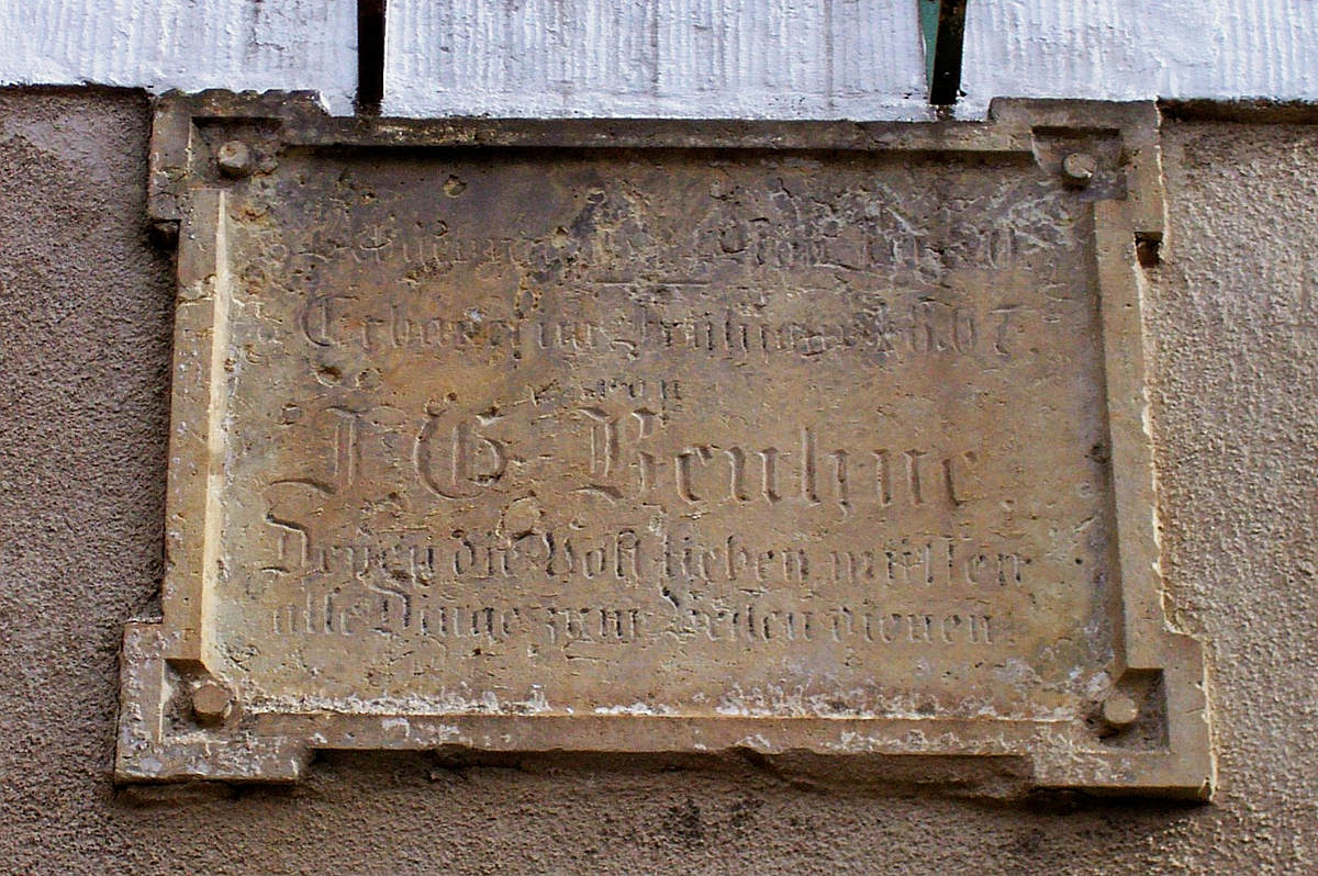 An der Giebelfront des Hauses befindet sich eine Tafel aus Sandstein. Sie soll erhalten bleiben. Die Tafel erinnert an die große Feuersbrunst von 1866. Ihr fielen acht Bauerngüter des Dorfes zum Opfer. Zu den Brandgeschädigten gehörte auch Carl Traugott Frantze (1825-1898). Er hatte sein Bauerngut im Jahre 1855 von der eigenen Mutter käuflich erworben. Von 1863 bis 1868 bekleidete er das Amt des Gemeindevorstandes. In dieser Eigenschaft hielt er den Ausbruch, Verlauf und die Folgen des Brandes schriftlich fest und fügte den Text als „Chronik des Jahres 1866″ den Trachauer Gemeindeakten bei. Dort heißt es: „1866, den 4. November, Sonntag abends, gegen 10 Uhr, ging eine schreckliche Feuersbrunst in unserem Dorfe auf. Bei Carl Gottlieb Frantze brach das Feuer von dem Heuboden und der mit Stroh gedeckten Scheune aus.“ Gemeindevorstand Carl Traugott Frantze und der von ihm genannte Carl Gottlieb Frantze waren nicht miteinander verwandt. Dieser hatte seinen Bauernhof 1860 für 5000 Taler dem Vater abgekauft. Der Hof befand sich hinter dem Gasthof zu Trachau, der seit 1881 den Namen „Goldenes Lamm“ führt.