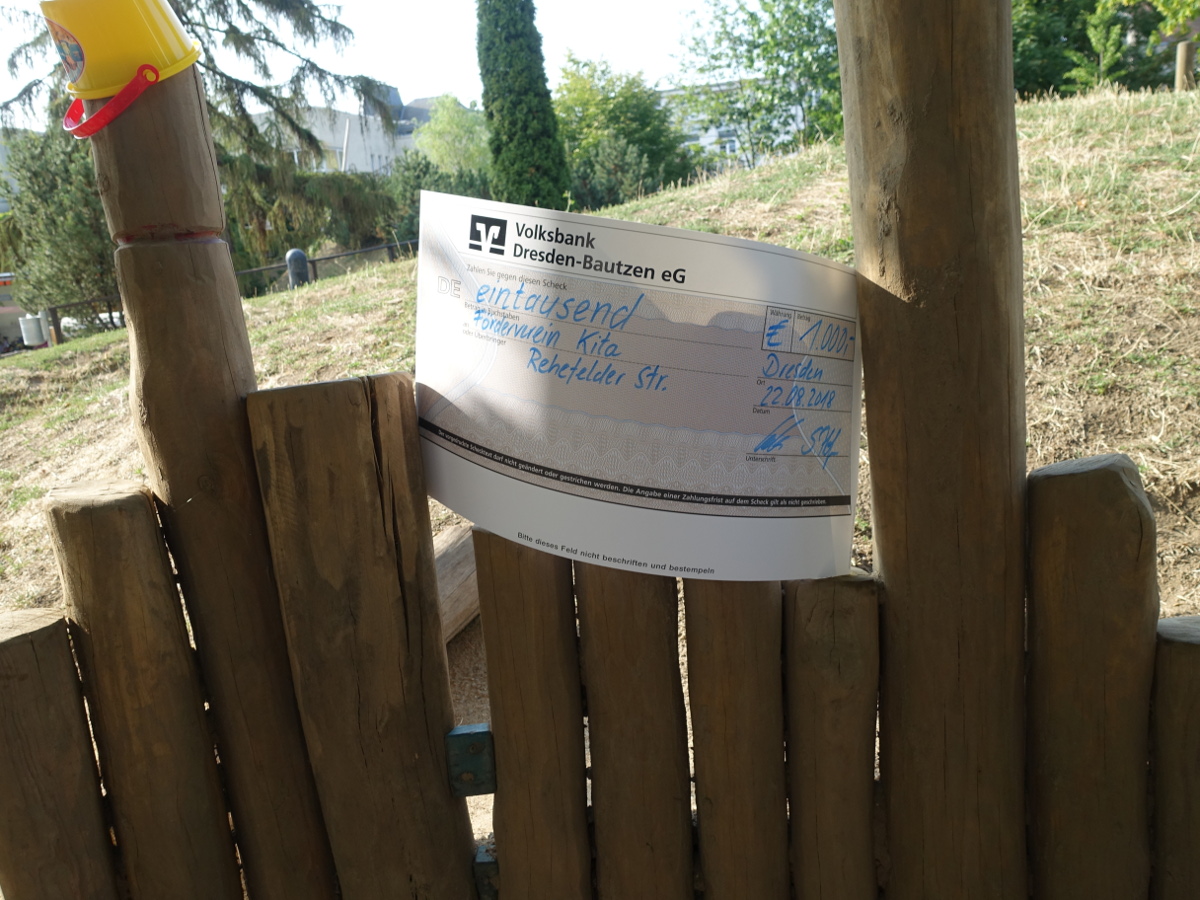 Weil das Buddeln am Hang sehr viel Spaß macht, musste eine Lösung her, beschreibt Jana Neumann vom Kita-Förderverein das Problem. Bisher hätten Kinder einfach drauflos geschippt. Das sei für die Stabilität des Hügels, an dem es auch noch eine Rutschbahn gibt, nicht so gut gewesen. Jetzt sichern Holzpfähle die halbrunde Buddelecke. Finanziert wurden die Kosten in Höhe von 2.500 Euro aus den Erlösen der Flohmärkte, den Beiträgen der etwa 40 Fördervereinsmitglieder sowie einer Spende der Volksbank in Höhe von 1.000 Euro, erklärt Jana Neumann.