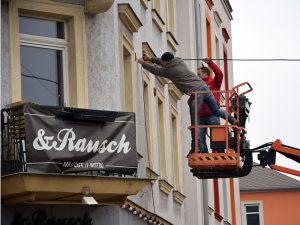Initiiert hatte die Aktion Fleischermeister Bernhardt, nachdem die „Oschi“ zwei Jahre lang ohne weihnachtliche Dekoration geblieben war. Er entstaubte die Leuchtelemente, begutachtete sie mit einem Elektriker, organisierte neue Lämpchen und eine Hebebühne, um die Lichter an den in fünf, sechs Metern Höhe gespannten Drähten anzubringen. Letzteres entpuppte sich als ganz schön knifflige und zeitraubende Angelegenheit: drei Leuchtelemente an jedem der neun Drähte, jedes muss einzeln befestigt und verkabelt werden. „Da kriegt man ganz steife Finger bei diesen Temperaturen“, kommentierte einer der Arbeiter in luftiger Höhe.