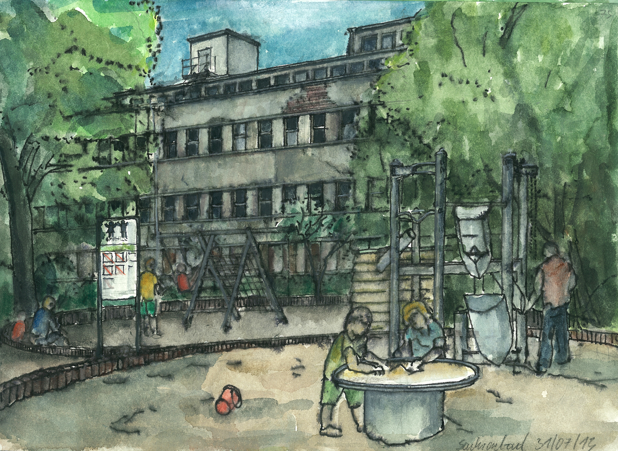 Das Bild „Sachsenbad“ entstand im Juli 2013. Dazu schreibt der Autor Christian Helms: „Als typisches Baudenkmal der zwanziger Jahre des vergangenen Jahrhunderts ist das Sachsenbad dem Stil der ‚Neuen Sachlichkeit‘ verpflichtet. Zusammen mit der Wohnanlage, der ehemaligen Bibliothek und den Läden aus gleicher Zeit bildet es ein städtebauliches Ensemble. Das einst intensiv genutzte Freizeit-, Erholungs- und Gesundheitszentrum ‚Sachsenbad‘ im damaligen Problemviertel Pieschen ist darüber hinaus auch ein Denkmal für die soziale Verantwortung der Kommunalpolitiker dieser Zeit. Seit 1994 wartet das Bad auf seine Sanierung.“ Seine Maltechnik beschreibt er als „aquarellierte Zeichnung“. Er verwende Bleistift, Füllfederhalter und Aquarell.