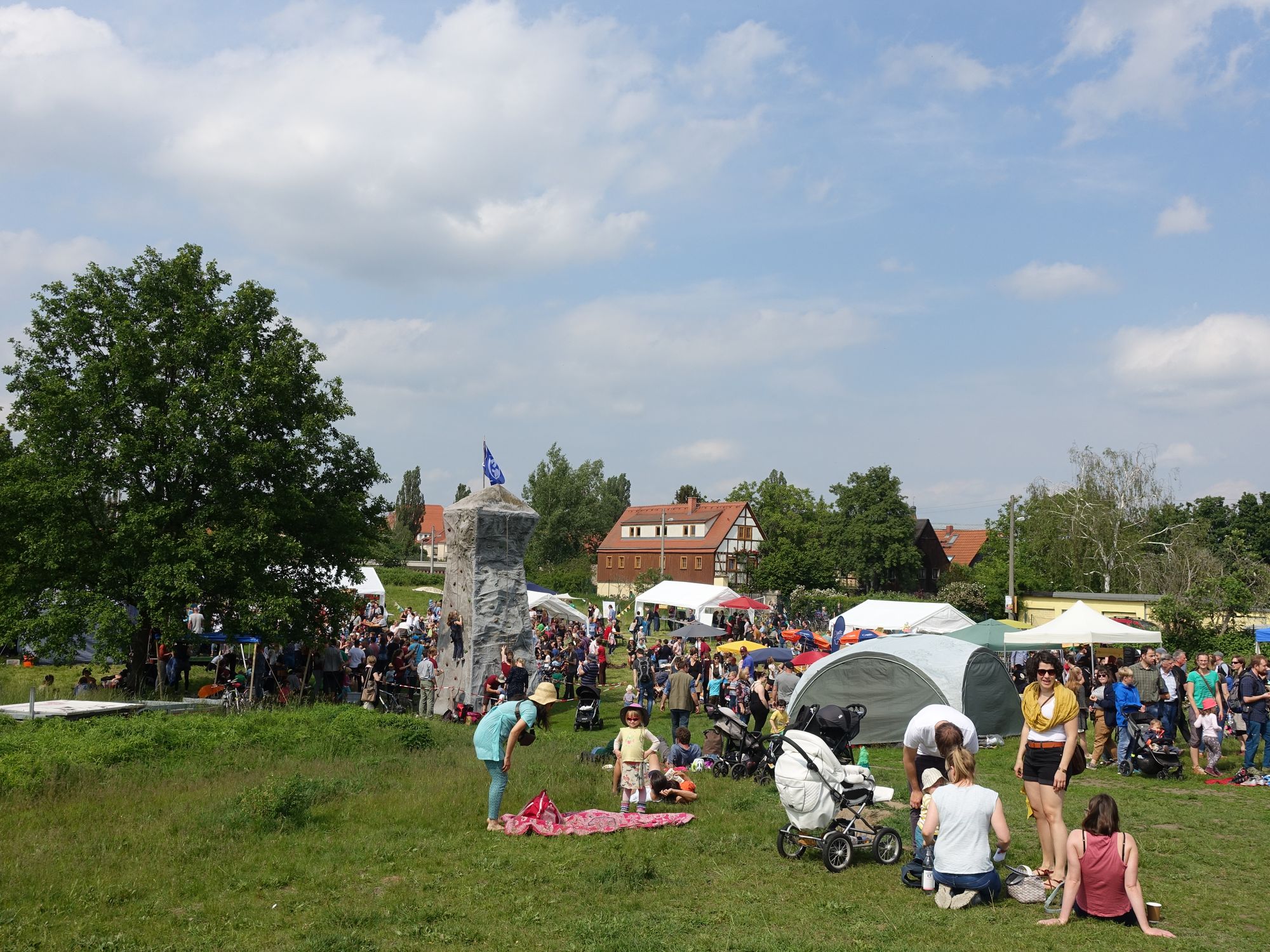 Kletterturm, Genussmeile, verschiedene Flohmarktstände mit Kinderspielzeug oder Büchern und ein abwechslungsreiches Programm auf der Bühne.