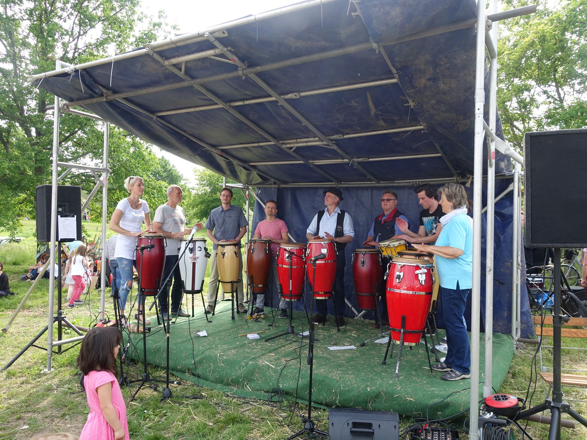 Friedemann Mütze von der Trommelschule Dresden hatte sich für Musik mit karibisch-afrikanischen Trommeln entschieden. Mit seinen acht Mitstreiterinnen und Mitstreitern munterte er die teils träge in der Sonne liegende und sitzende Publikum auf. 120 Schüler aus allen Altersgruppen werden in der privaten Musikschule von einem sechsköpfigen Lehrerteam unterrichtet. „Uns gibt es schon seit 25 Jahren“, sagte der Chef der Trommler.