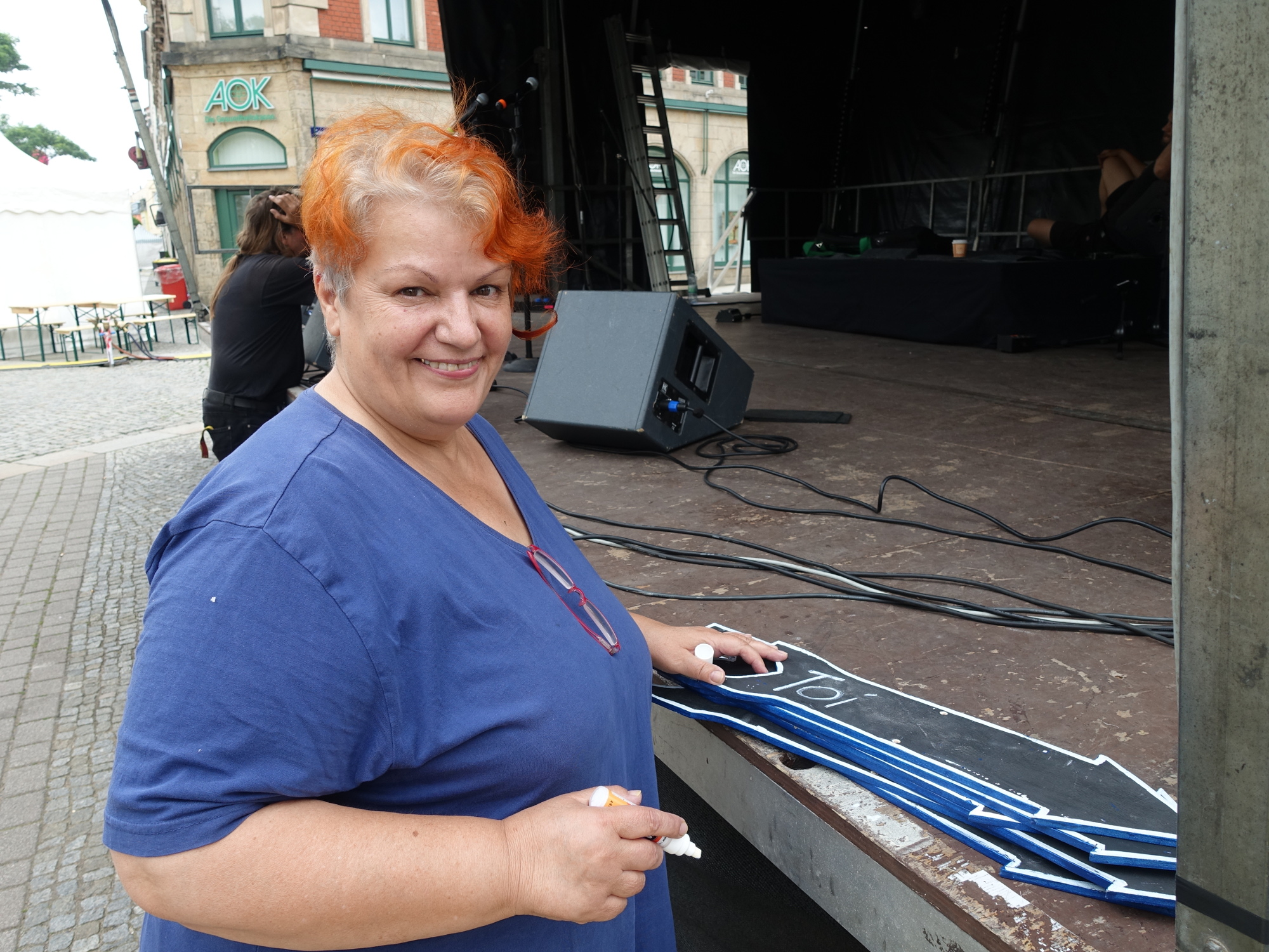 Für alle Besucher, die sich in Pieschen nicht so gut auskennen, beschriftet Heidi Geiler vom sankt pieschen e.V. gerade Wegweiser. Nicht nur für die ganz wichtigen Toiletten. Auch für die Räuberbühne, Ostpolbühne, Nordendbühne, Torgauer Straße und St. Markus-Kirche wie auch die Kreative Werkstatt im Galvanokunsthof. Alle Mitwirkenden, so sagt sie, auch die, die nicht unmittelbar in den Pieschener Melodien und in der Oschatzer Straße stehen, sollen von den vielen Gästen gefunden werden.