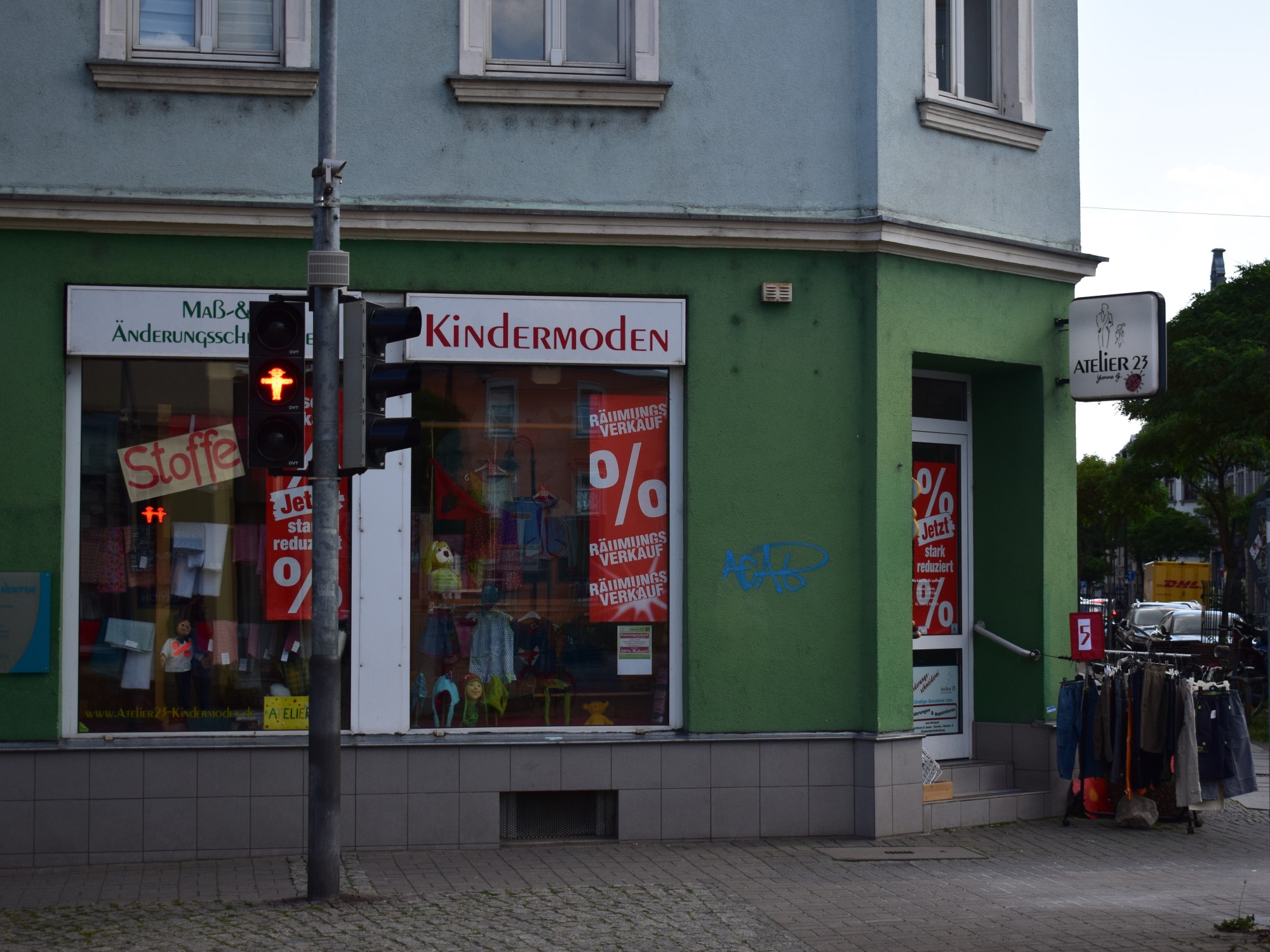 Ce que j’ai remarqué en premier ici sont les nombreux magasins de couture et de tissus. Il y en a vraiment beaucoup. En se promenant le long de la Bürgerstraße ou de la Oschatzer Straße, on peut déjà en trouver cinq. Le magasin que j’ai vu en premier est „l’Atelier 23“, qui a fermé le 21 juin. En ce moment il y a des rénovations. Le prochain locataire est déjà fixé. Le „Nähkabinett“ de la Oschatzer Straße 12 y emménage.