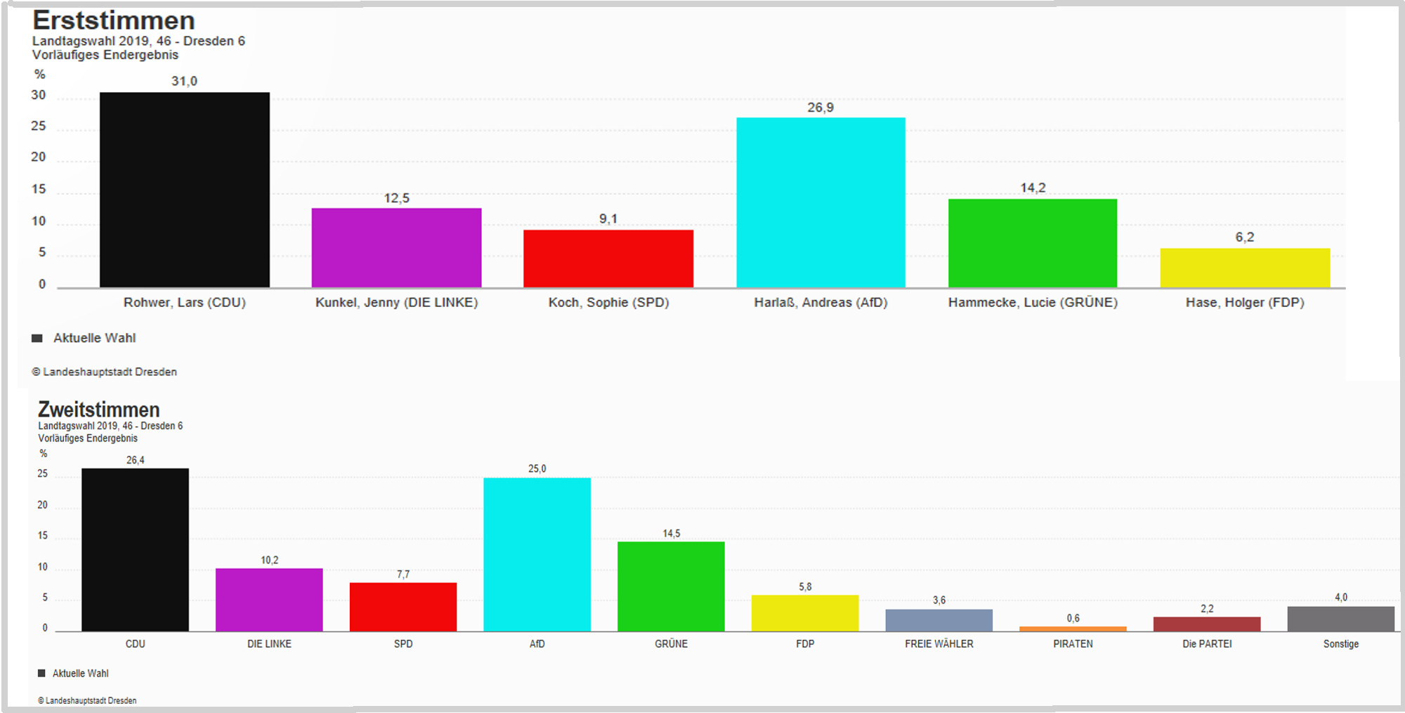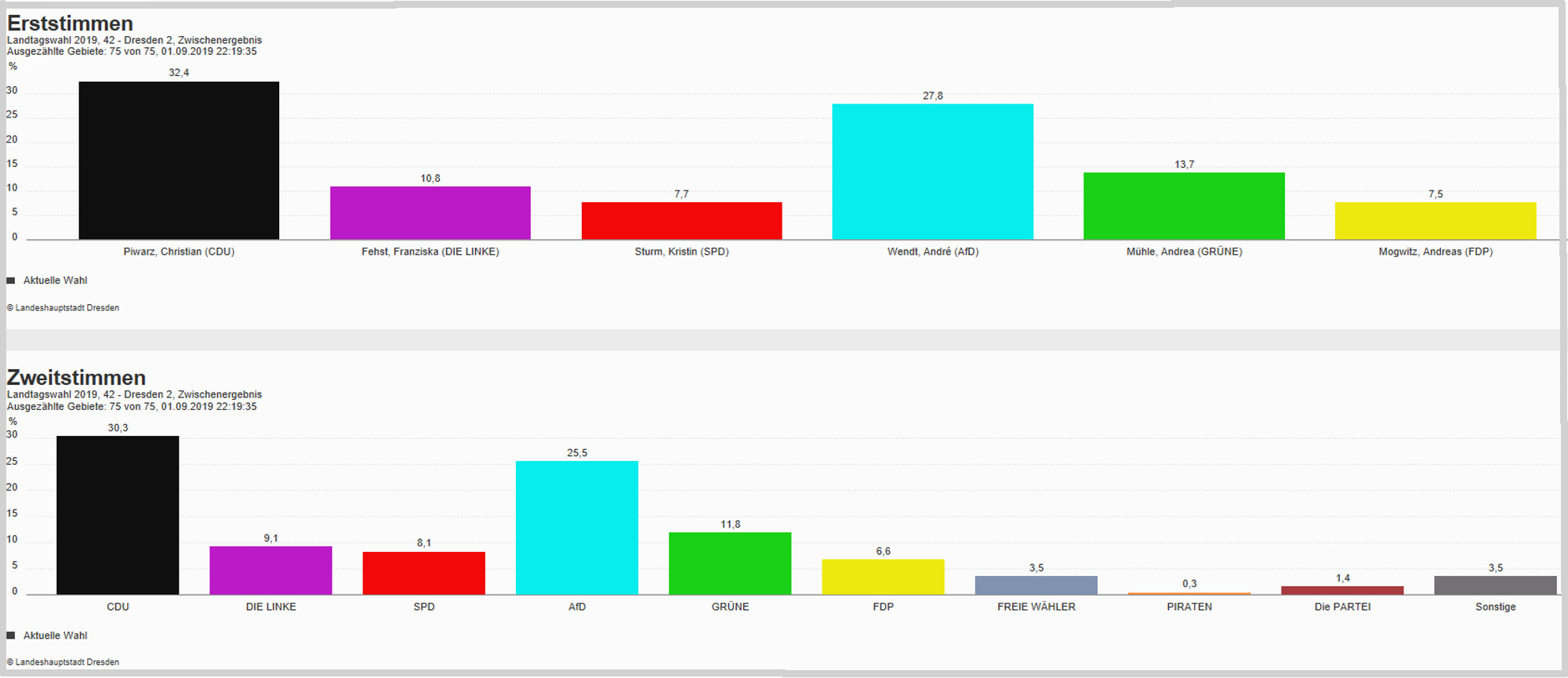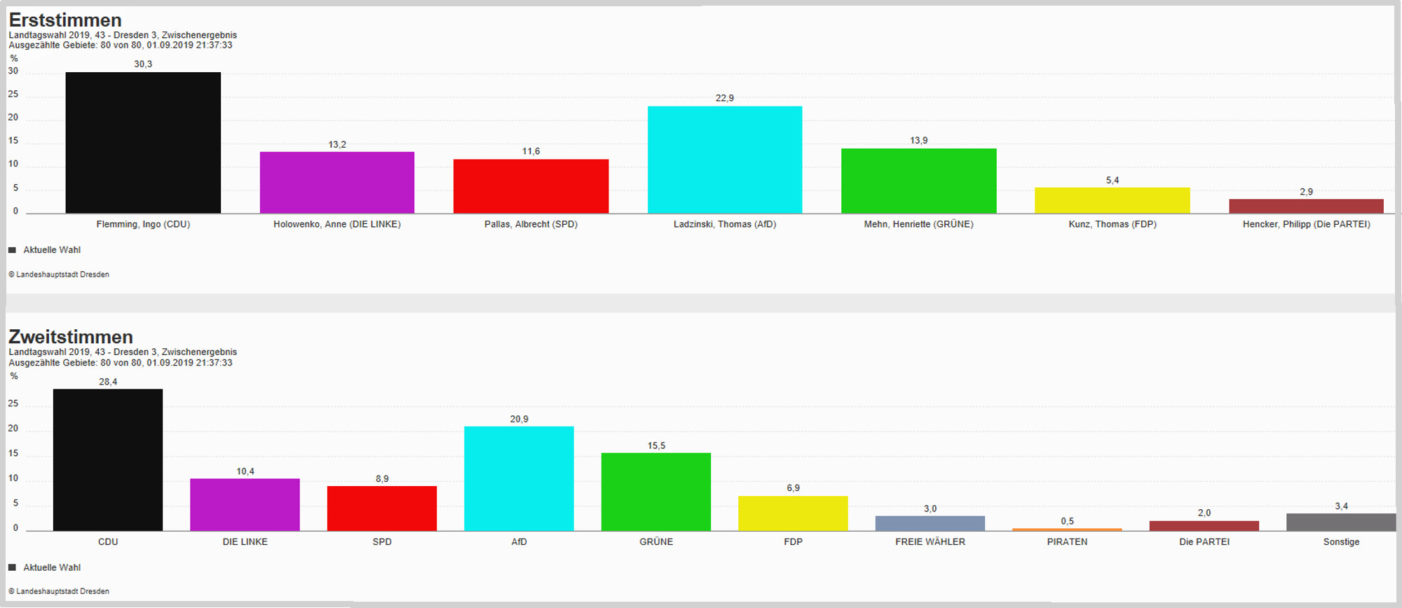 Die Dresdner CDU hat sechs der sieben Wahlkreise in der Landeshauptstadt gewonnen. In fünf der sechs gewonnenen Wahlkreise lag sie deutlich vor den Konkurrenten von der AfD. Nur im Dresdner Norden, im Wahlkreis 41, erreichte mit Valentin Lippmann ein Bündnisgrüner den zweitmeisten Stimmen.