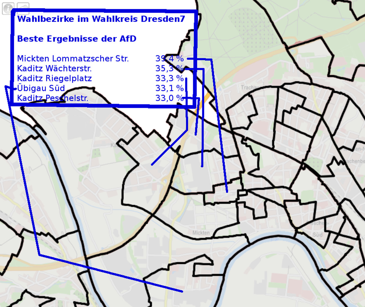 Im Stadtbezirk Pieschen zeigen die Wahlergebnisse klare politische Präferenzen. Die meisten Stimmen in den Wahlbezirken erzielten entweder die AfD, die CDU oder die Grünen. Während die AfD vor allem in Übigau, Mickten und Trachau Süd dominiert, erzielt die CDU in Kaditz, Trachau und Trachenberge ihre besten Ergebnisse. Die Grünen dominieren in Pieschen Süd und Stadt Neudorf. Überraschend landete die Die Linke in keinem der Wahlbezirke auf dem ersten Platz.
