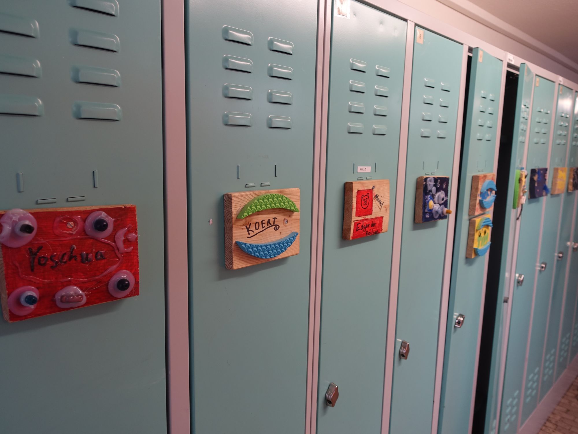 Selbst gebastelte Namensschilder zieren die Blechspinde. Foto: W. Schenk