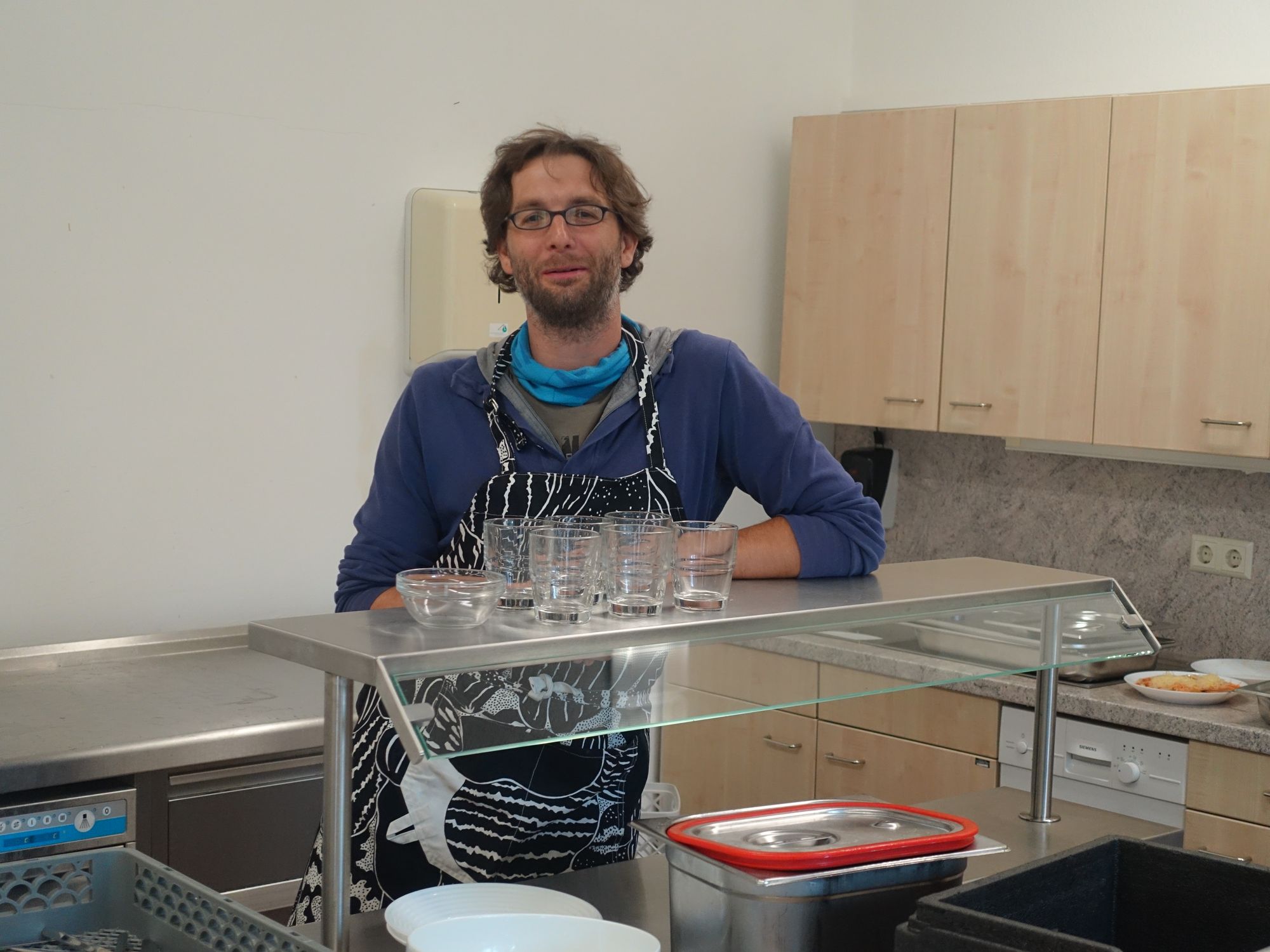 Schürze muss sein: Hortleiter Sascha Förster macht heute die Krankheitsvertretung in der Küche. Foto: W. Schenk