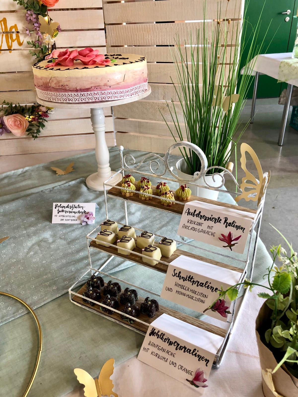 Zum Beispiel mit den selbst kreierten Pralinen – Avocadoganache auf Krokant. Wie bitte? Auf mein Fragezeichen im Gesicht erläutert sie. „Das ist eine Creme aus pürierter Avocado, Schokolade, Limettensaft und Zitronensaft. Das Ganze wird aufdressiert, das heißt, mit einer Spritztülle geformt.“ Die Hohlkörperpraline habe sie mit einer Füllung aus Hanf mit Butter, Kurkuma und Orange versehen. Als dritte Sorte seien Schnittpralinen gefragt gewesen.