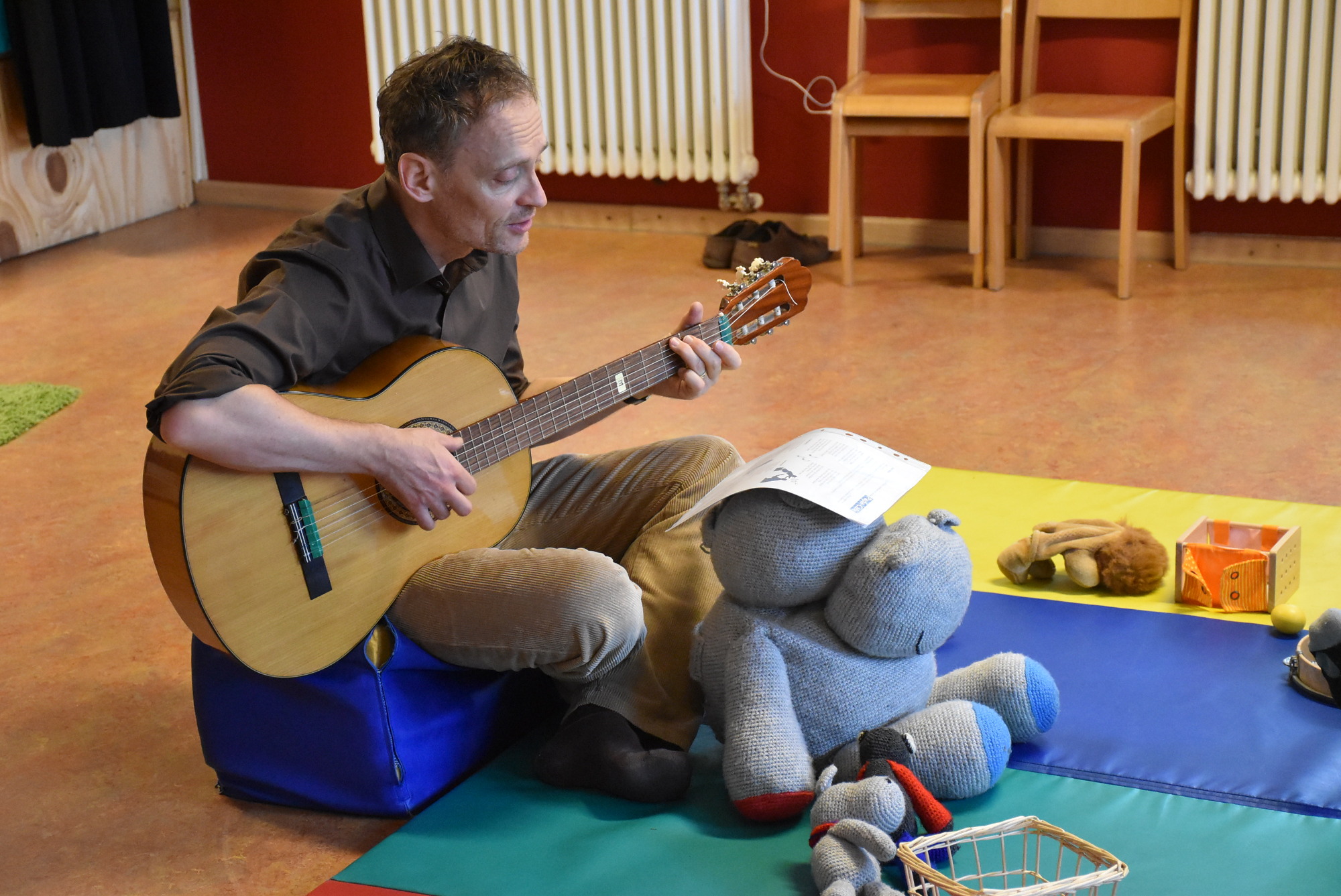 Nach und nach setzen sich Väter und Kinder im Kreis auf die Matten und Stefan Höring eröffnet das Papa-Café mit einem Begrüßungslied. Das Besondere daran: Die Namen aller anwesenden Kinder und dazugehörigen Väter werden nacheinander mit einbezogen. Mit Gitarrenbegleitung folgen weitere Kinderlieder und Fingerreime. Nach dieser Aufwärmrunde haben die Väter Gelegenheit, sich bei einer Tasse Kaffee, die es ab 10 Uhr im Café des Kinder- und Jugendhauses gibt, zu unterhalten: über Fragen von Schlaf- oder Essgewohnheiten ihres Nachwuchses und alle anderen Dinge, die das Vatersein so mit sich bringen können.
