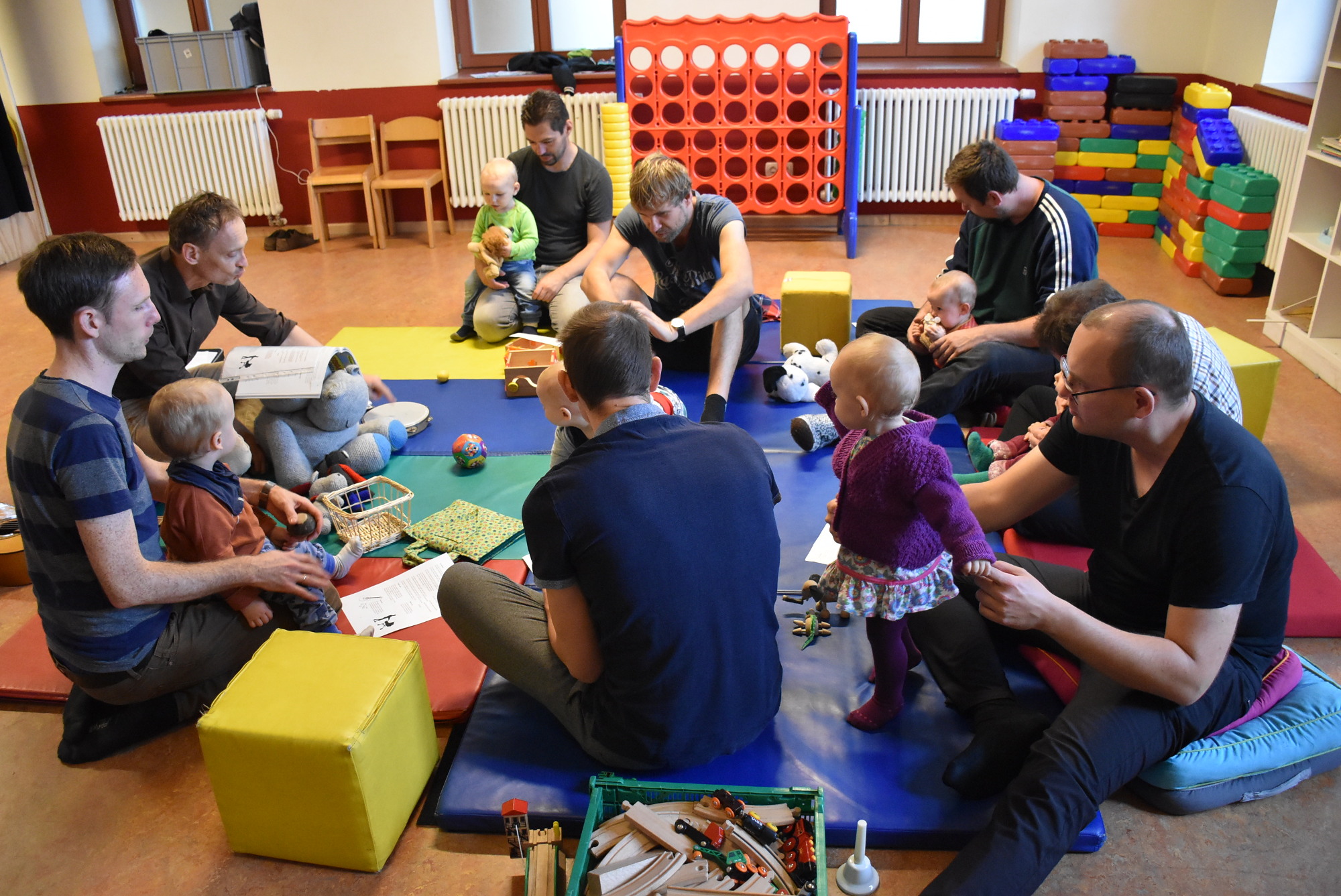 Die Kinder erkunden inzwischen die zahlreichen Spielmöglichkeiten, spielen selbständig, kommen nach und nach miteinander in Kontakt oder spielen auch gemeinsam mit ihren Vätern. Fast ein „Muss“ ist der Aufbau einer Holzeisenbahn. Es ist schön zu beobachten, wie dann auch die jungen Väter wieder zu Kindern werden.