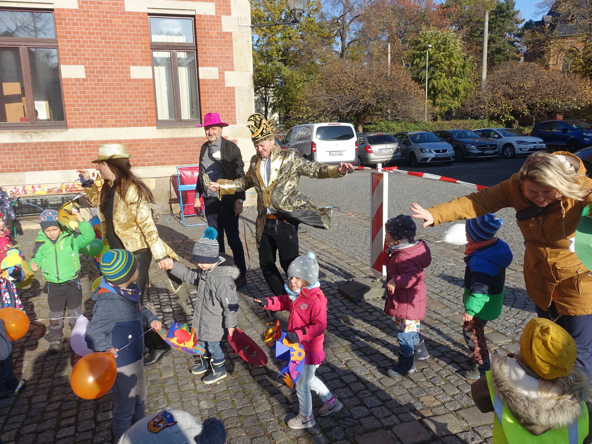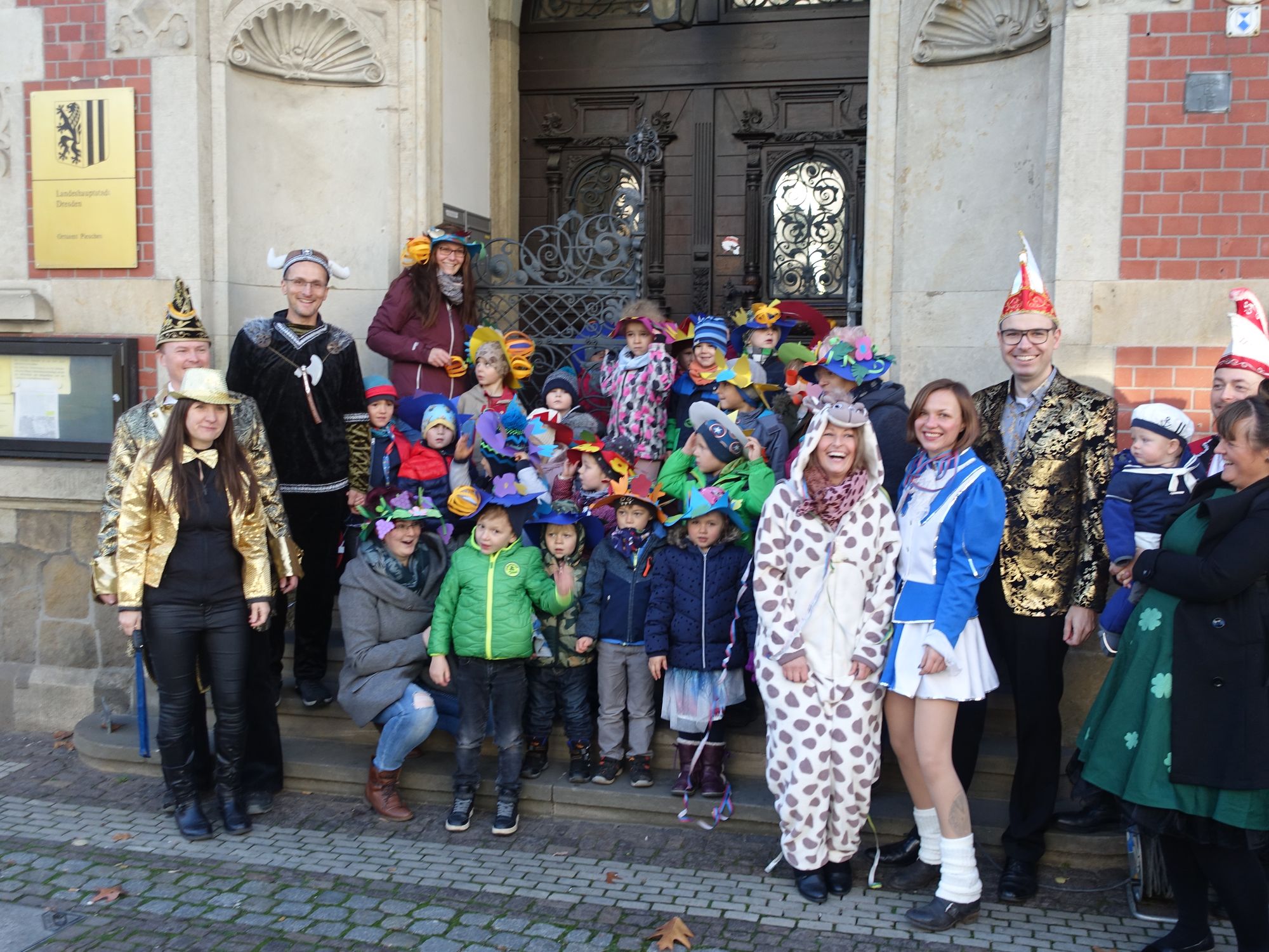 Das Rathaus Pieschen ist seit heute in den Händen der Jecken vom Verein Pieschener Kneipenkarneval. Mit lautstarker Unterstützung der Kinder aus der Kita „Pfiffikus“ stürmten sie das Rathaus. Christian Wintrich, Leiter des Stadtbezirksamtes, gab sich geschlagen und sagte zu den Kindern. „Ihr habt so kräftig an der großen Rathaustür gerüttelt und gedrückt, dass ich keine Chance hatte.“ Begleitet vom Jubel der Kinder und dem Beifall der Jecken übergab er den symbolischen goldenen Schlüssel an Lutz Herrmann, einen der Initiatoren des Pieschener Kneipenkarnevals. Mit einer Polonaise durch das Rathaus wurde dann unter teils erstaunten Blicken der auf eine Sprechzeit Wartenden die Schlüsselübergabe gefeiert. Es ist das erste Mal – zumindest in den vergangenen 30 Jahren – dass der Herr des Rathauses am 11.11. den Schlüssel rausrückt. Und wohl auch das erst Mal, dass dies in einem Stadtteil-Rathaus in Dresden geschieht.