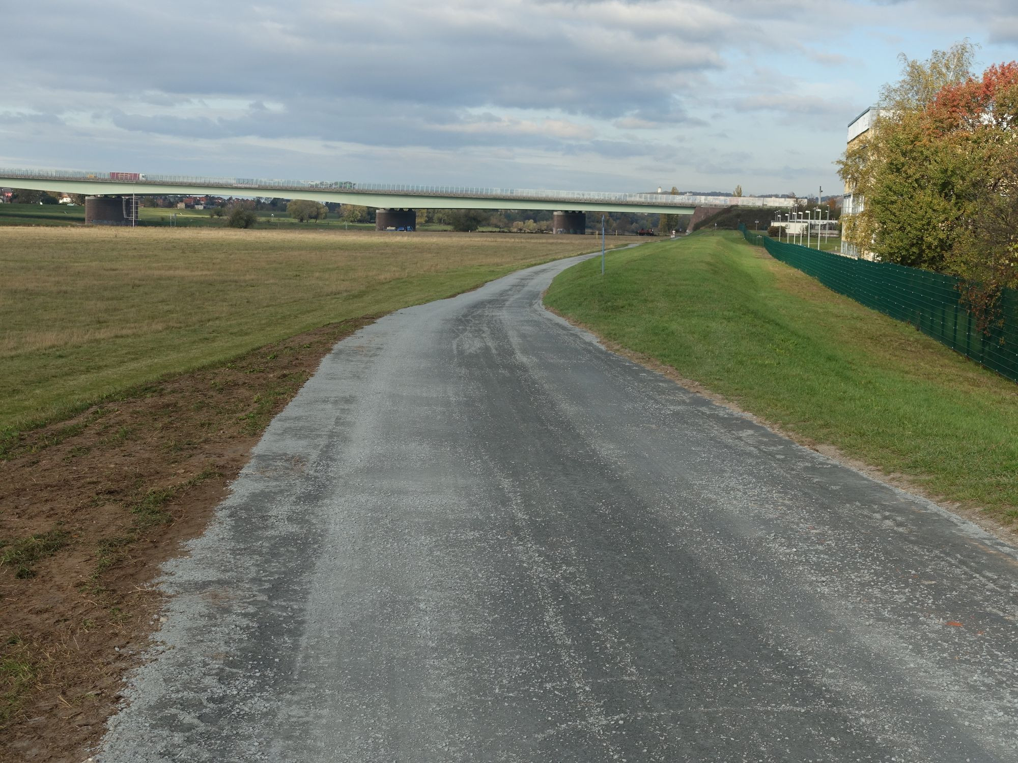 Der neu gebaute Abschnitt des Elberadweges zwischen der Autobahnbrücke und Altkaditz ist freigegeben. Seit vergangenem Freitag können Radfahrer und Fußgänger auch die neue Schotterpiste zwischen dem Ende der Scharfenberger Straße und der A4-Brücke nutzen. Mit einer langgestreckten Rampe ist der neue Abschnitt des Elberadweges jetzt an die Autobahnbrücke angebunden. So kann die Elbe bequem überquert werden.