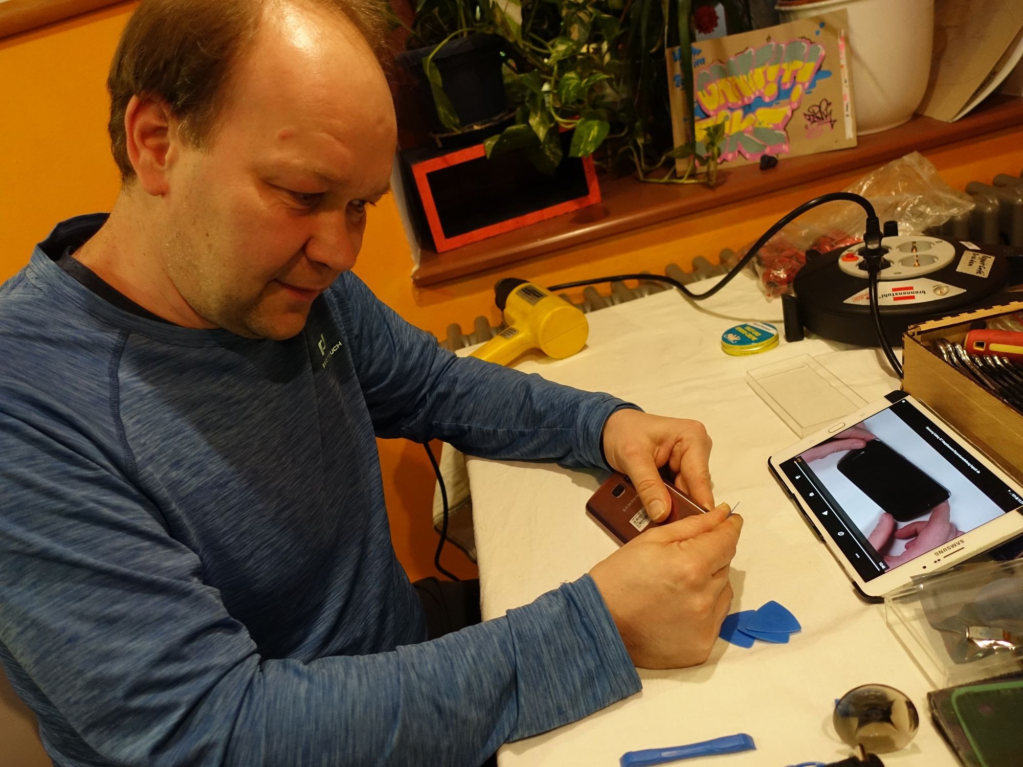 „Das sind 23 kleine fiese Lötstellen an dieser defekten Festplatte von Hitachi“, konstatierte Georg. Abschrecken ließ er sich davon nicht. Er lötete die SATA-Schnittstelle von einem baugleichen Modell ab und an der defekten 1-Terrabyte-Festplatte an. Der Besitzer wollte sie nicht wegwerfen. Zwischendurch wurde gefachsimpelt, Kaffee getrunken und ein Stück Kuchen verzehrt. Einen Tisch weiter sitzt Steffen aus Weinböhla. Er will die Kamera an seinem Samsung Galaxy S7 austauschen, hat aber zu Hause kein passendes Werkzeug. Darum machte auch er sich auf den Weg ins Repaircafé in Pieschen. Jeden dritten Donnerstag im Monat gibt es diese ungewöhnliche Reparaturwerkstatt, in der es in erster Linie um Hilfe zur Selbsthilfe geht, mit Kaffee und Kuchen im Stadtteilzentrum Emmers in der Bürgerstraße.