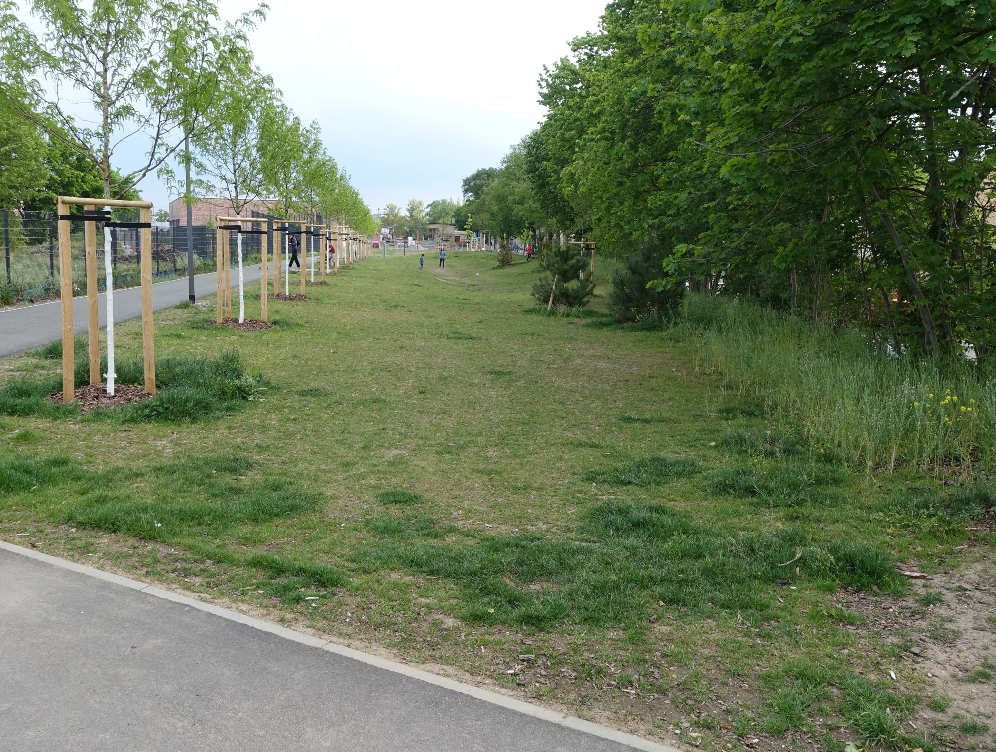 Das südliche Ende der Parkanlage ist bereits fertiggestellt und nutzbar. Es ist gleichzeitig das Entrée zum Schulcampus Gehestraße. Hier wurden zwölf Schnurbäume gepflanzt. Ringsum wachsen Stauden, Sträucher und ein buntes Meer aus Tulpen.