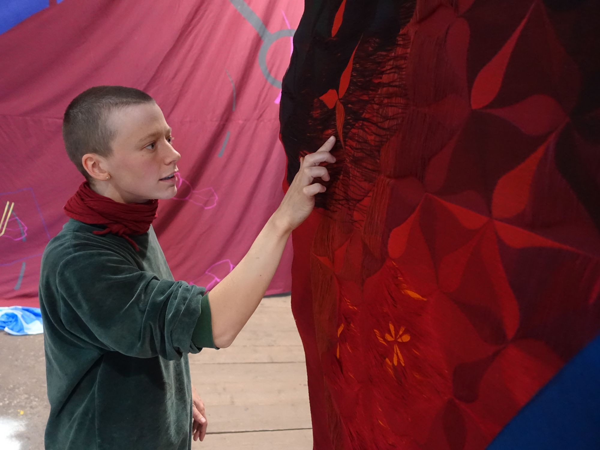 Freya Schweer und Anne Reiter haben sich beim Studium an der Hochschule für Bildende Kunst in Dresden kennen gelernt. Während Anne Reiter hier ihren Abschluss machte, ging Freya Schweer nach Halle an die Burg Giebichenstein Kunsthochschule. „Wir sind in Kontakt geblieben, dann haben wir uns in unseren Arbeiten mit ähnlichen Themen auseinandergesetzt“, erzählen sie. Dazu gehört ohne Zweifel auch der Anspruch, einen Ausweg aus „gewaltvollen binären Gender-Normen“ zu finden. „Textile Raumnahme, ornamentale Strukturumwandlung ist eine feministische Intervention mittels textiler Praktik“, heißt es darum in ihrer Ausstellungsbeschreibung.