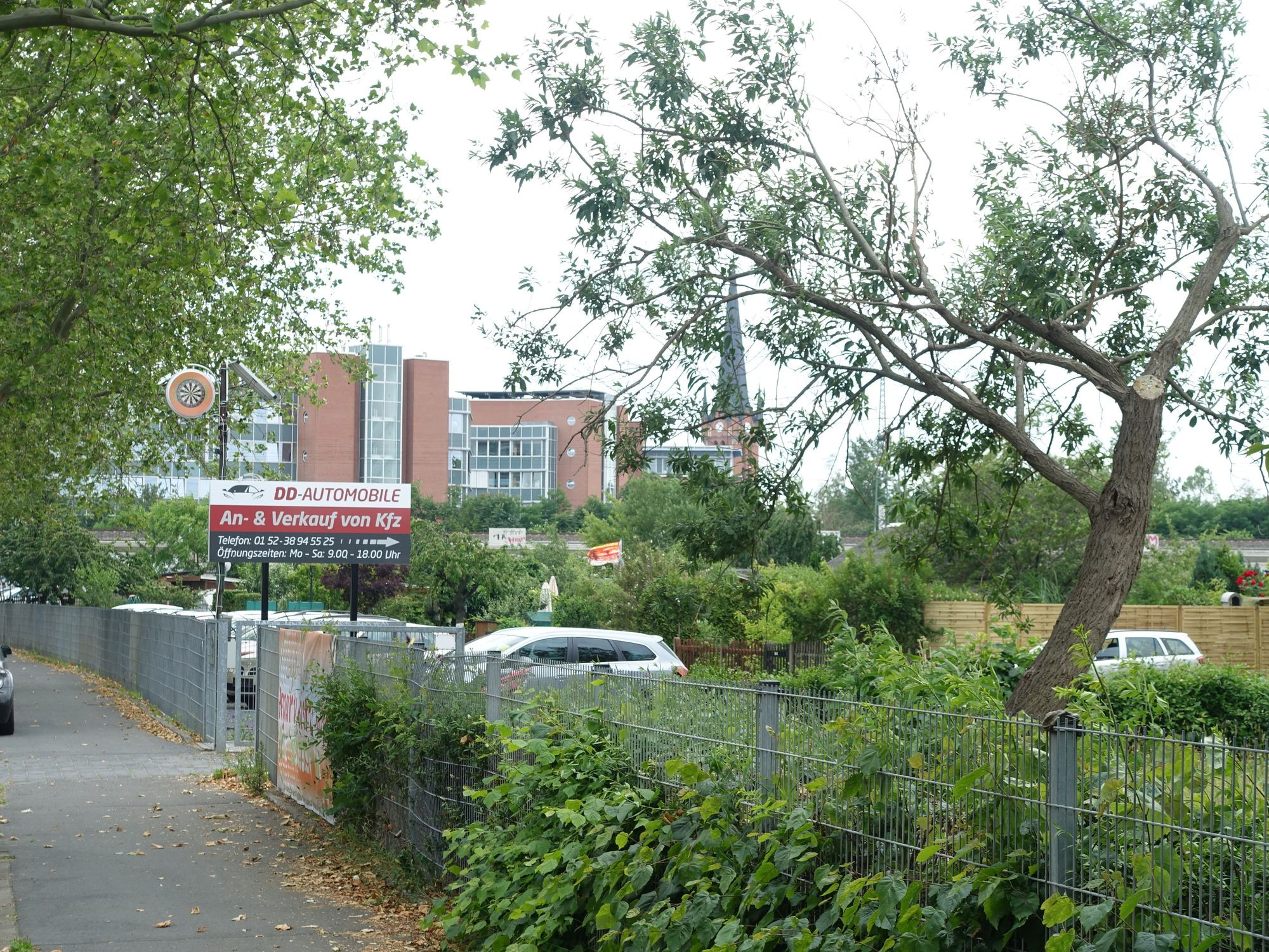 Um die Nutzung ehemaliger Gärten an der Hansastraße 45 als Gewerbefläche gibt es seit mehreren Wochen einen Streit. Seit März 2020 befindet sich hier, gleich neben Sylvis Dartstube, ein Gebrauchtwagenhändler. Er wirbt auf einer großen Tafel als „DD Automobile“. „Ich habe die Fläche vom Eigentümer gemietet“, sagt der Inhaber am Telefon.