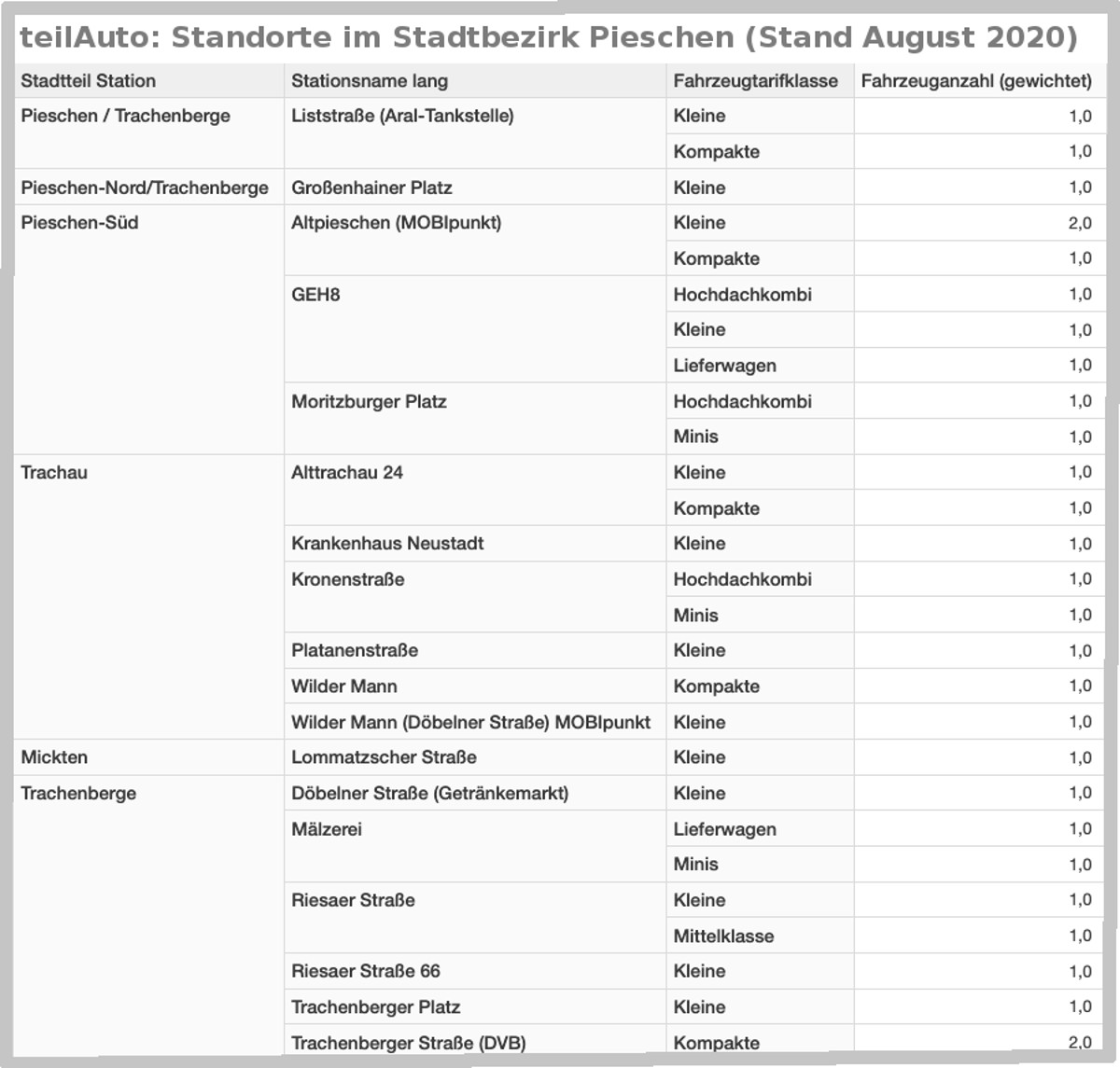 Insgesamt gibt es im Stadtbezirk Pieschen jetzt 29 Fahrzeuge von teilAuto in verschiedenen Fahrzeugklassen wie Minis, Kleine, Kompakte, Mittelklasse, Hochdachkombi oder Lieferwagen. Transporter oder Busse von teilAuto gibt es hier nicht, dafür aber zum Beispiel am Bahnhof Neustadt.