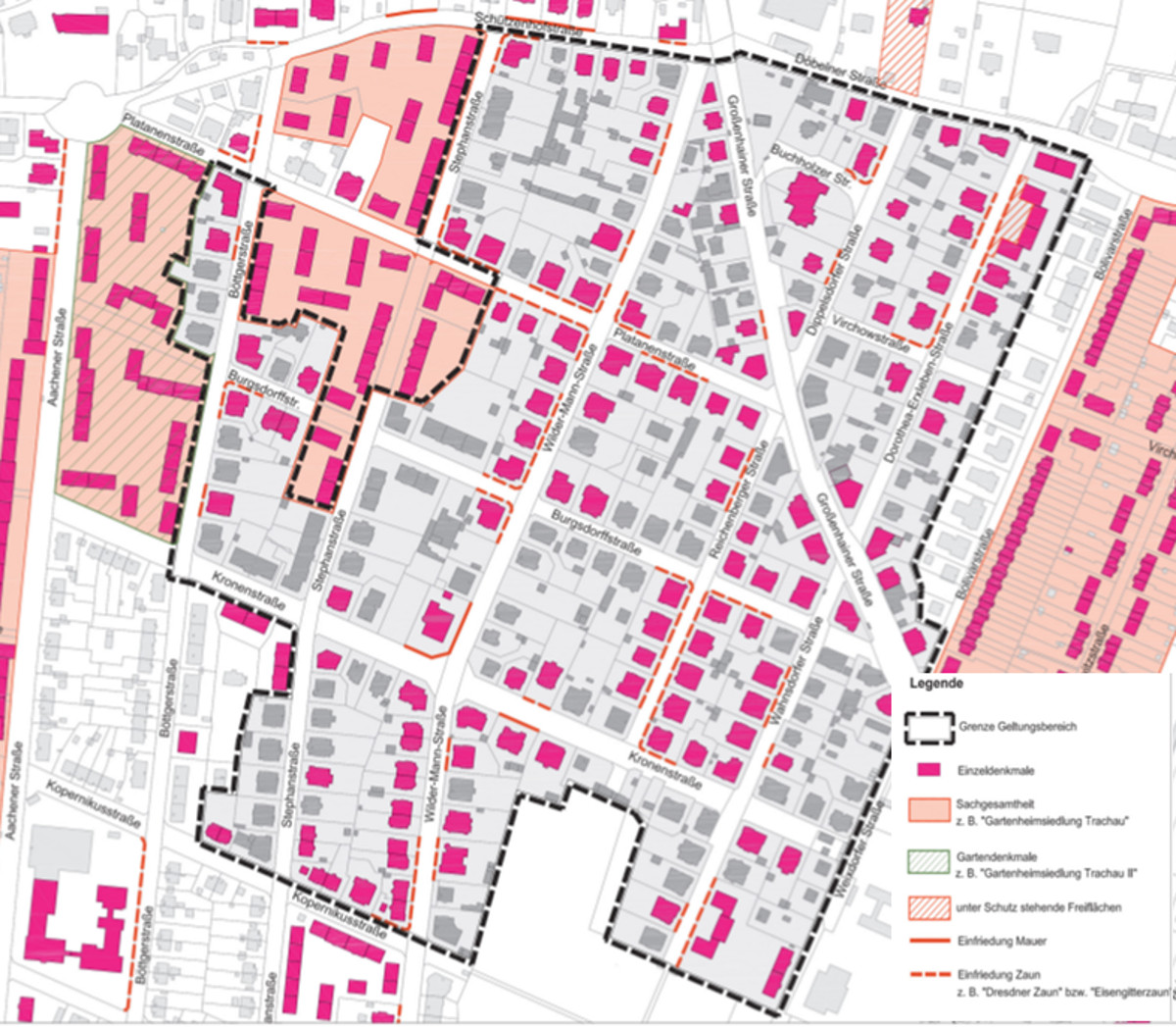 Die Aufstellung einer Erhaltungssatzung für das Villengebiet Wilder Mann in Trachau geht jetzt in die nächste Phase. Ab Montag, 17. August, sind Bürgerinnen und Bürger gefragt, ihre Vorschläge, Hinweise und Ideen zum Entwurf einzubringen. Dafür haben die Fachleute aus dem Stadtplanungsamt eine 30-seitige Bestandsanalyse vorgelegt. Detailliert und mit vielen Fotonachweisen werden die Entstehung, die typische Architektursprache, die Art der Neubauten nach 1990, der Überbauungsgrad und viele andere wichtige Gestaltungsmerkmale der Häuser, Straße und Plätze dargestellt. Der Geltungsbereich für das zu schützende Gebiet wurde im Nordwesten reduziert. „Der Siedlungsbau der 1920er Jahre zwischen Aachener Straße und Stephanstraße stehe bereits denkmalrechtlich unter Schutz“, heißt es zur Begründung. Die öffentliche Beteiligung ist bis zum 14. September möglich.