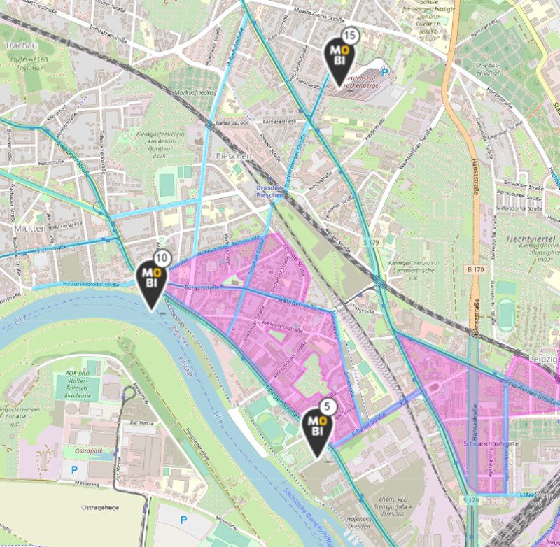 Am gerade fertig gestellten Mobipunkt Puschkinplatz in der Eisenberger Straße stehen bereits fünf nagelneue schwarz-gelbe Leihräder. Auch der Mobipunkt in Altpieschen ist bereits umgerüstet – hier warten 15 Räder auf neue Nutzer. Der dritte Standort für weitere zehn Fahrräder ist der Betriebshof Trachenberge. Die Zweiräder gehören zum neuesten Angebot der Dresdner Verkehrsbetriebe: 1.000 Leihräder, über die gesamte Stadt verteilt. Entlang der in der Mobiapp blau gekennzeichneten Straßen können die Räder kostenlos abgestellt werden. Das gilt zum Beispiel für die gesamte Leipziger Straße bis zur Kreuzung Peschelstraße oder die Großenhainer Straße. In den pink gefärbten Regionen wird für das Parken ein Aufpreis von 1 Euro fällig. Wer das Rad an einem Mobipunkt zurückgibt, erhält eine 10-Minuten-Zeitgutschrift.