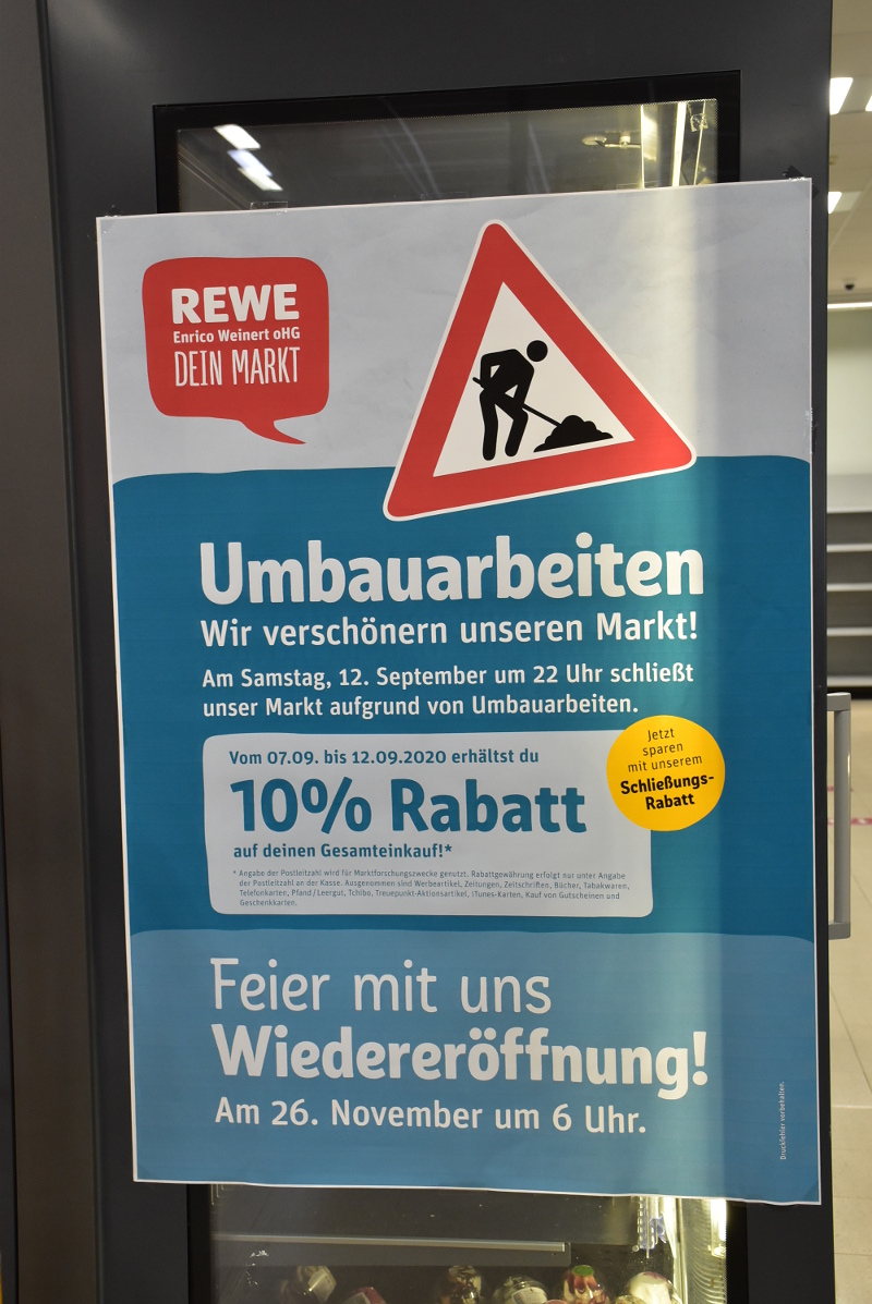Seit einigen Tagen herrscht zunehmende Leere in immer mehr Regalen im Rewe-Markt im ehemaligen Straßenbahn-Depot Mickten. Ein großes Plakat im Markt klärt auf: nur noch bis zum 12. September ist er geöffnet, danach beginnt ein größerer Umbau. Am 26. November ab 6 Uhr wollen Marktleiter Enrico Weinert und sein Team wieder ihre Kunden begrüßen – in dem dann im neuen Glanz erstrahlenden Rewe-Markt. Auch nach dem Umbau wird der Markt von Montag bis Sonnabend von 6 bis 22 Uhr geöffnet sein.