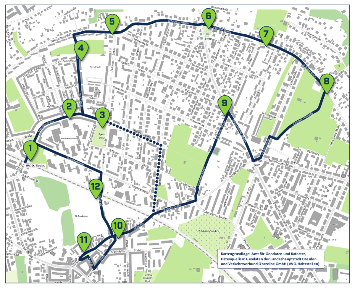 Der Startpunkt ist am Bahnhof Haltepunkt Trachau, dann geht es über die Kopernikusstraße oberhalb des Städtischen Klinikums Neustadt an der Hans-Richter-Siedlung weiter. An dieser Stelle führt die Abkürzung entlang der Grünanlage Aachener Straße bis zur Wilder-Mann-Straße weiter in Richtung Alttrachau. Für die große Runde setzt sich der Pfad von der Apostelkirche weiter entlang der Trobischstraße hinauf zur Schützenhofstraße, entlang der Döbelner Straße, durch den Trachauer Heideweg, über den Hubertusplatz nach Alttrachau fort. Von dort geht es über die Gaußstraße, vorbei an der Station Nr.12, zurück zum Trachauer Bahnhof. Begleitend zum Pfad soll eine Broschüre erscheinen, die weiterführende Informationen zu den einzelnen Tafeln enthalten wird. Eine feierliche Eröffnung des Geh-sundheitspfades ist im Verlaufe des Jahres 2021 geplant.