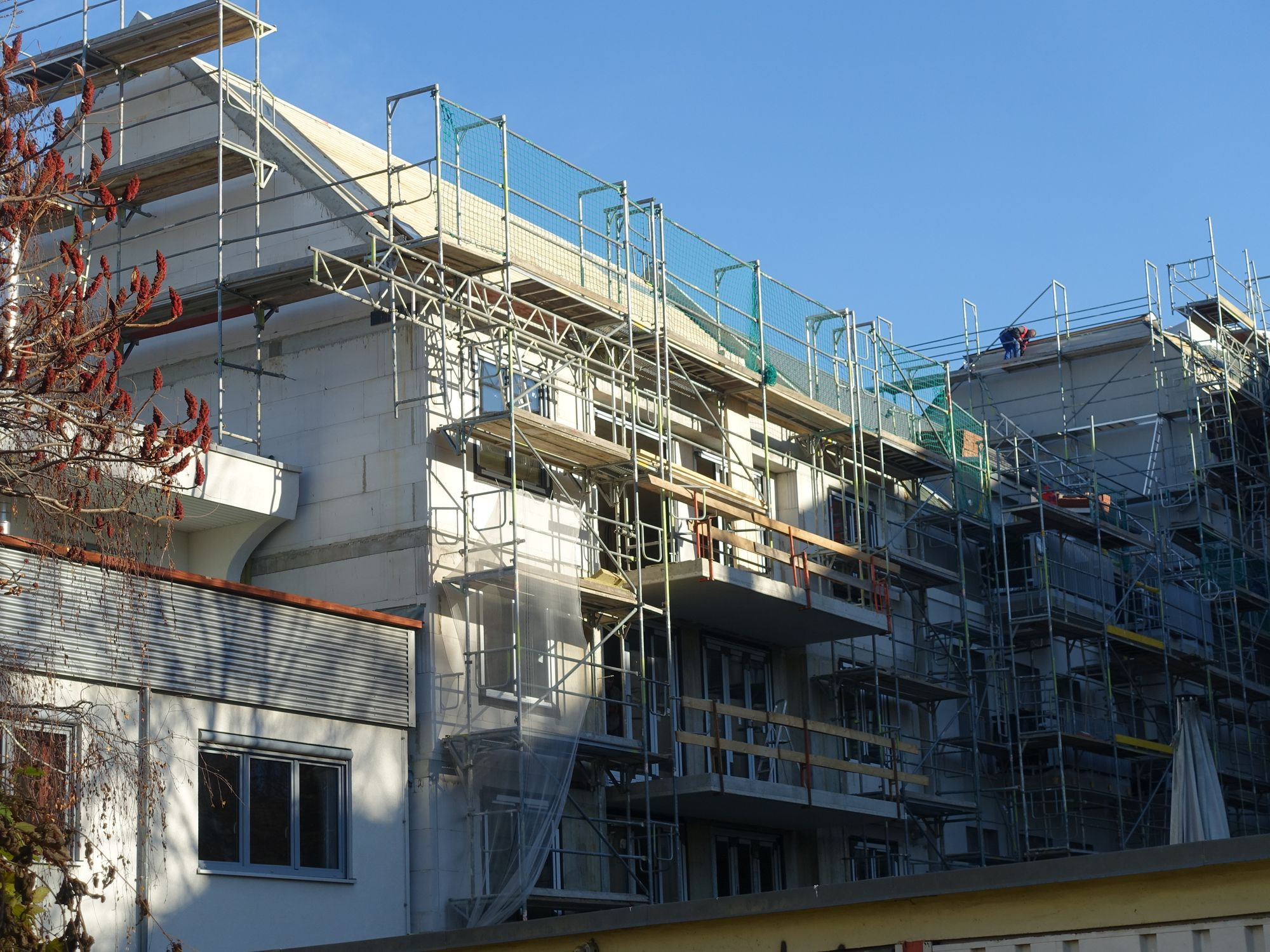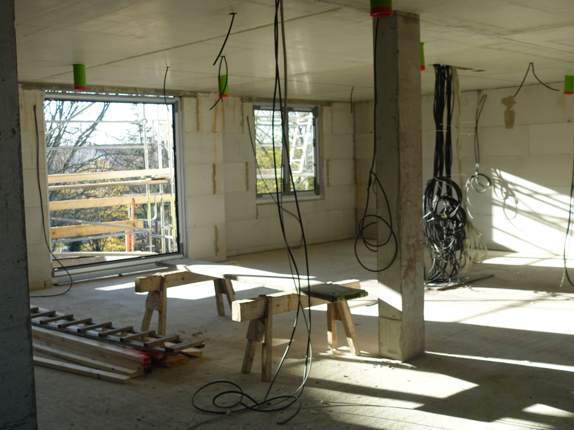 Im Erdgeschoss finden sich neben drei Pkw-Stellplätzen ein Fahrrad-Raum und ein Gemeinschaftsraum mit einem kleinen Bad. Das kann auch mal als Gästezimmer dienen. Der Bau ist halb unterkellert. Hier gibt es Platz für die Haustechnik und drei kleine Abstellräume. Auf den drei Etagen darüber sind noch keine Zimmerwände eingezogen. Was aus dem Raum unter dem Spitzdach wird, müssen die Bauherren noch überlegen. Eigentlich wollten sie aus Kostengründen ein Flachdach bauen – wie beim Haus rechts nebenan. Die Stadtplaner haben sich jedoch an dem Nachbarn auf der anderen Seite orientiert und eine andere Dachform gefordert. Im Moment, so Lämmel, seien die finanziellen Spielräume bei den drei jungen Familien ausgeschöpft. Die Baukosten würden ohnehin höher als geplant liegen.