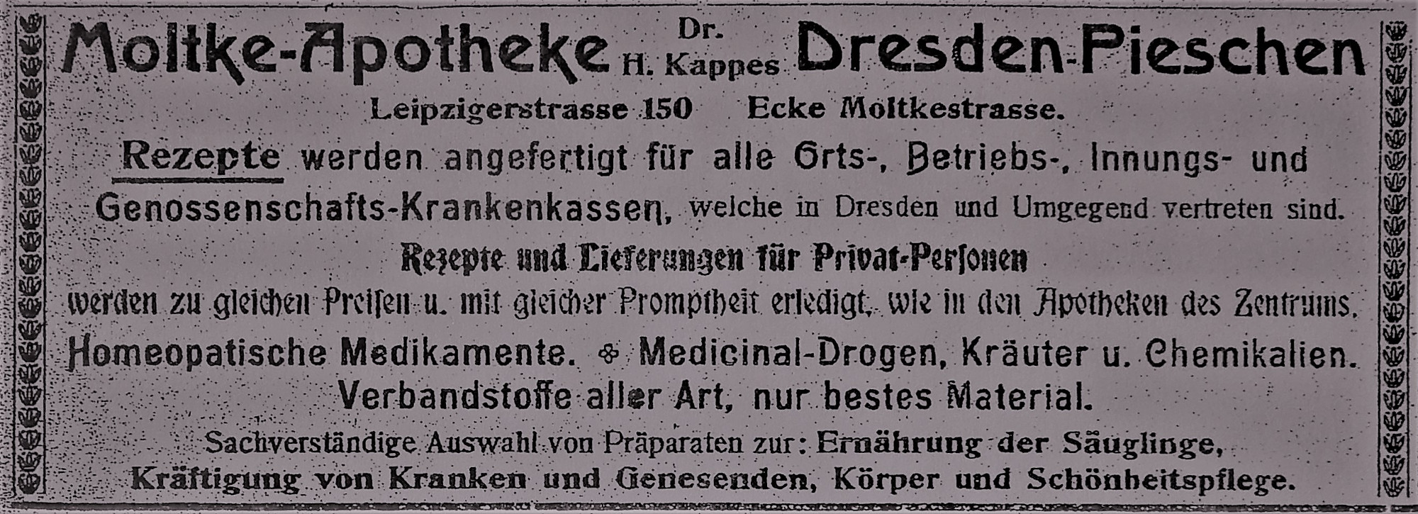 Zu den Inserenten des Vereinsblattes „Dresdner Nordwestbote“ zählte von Beginn an auch die „Moltke-Apotheke“ in Pieschen. Quelle: Archiv K. Brendler