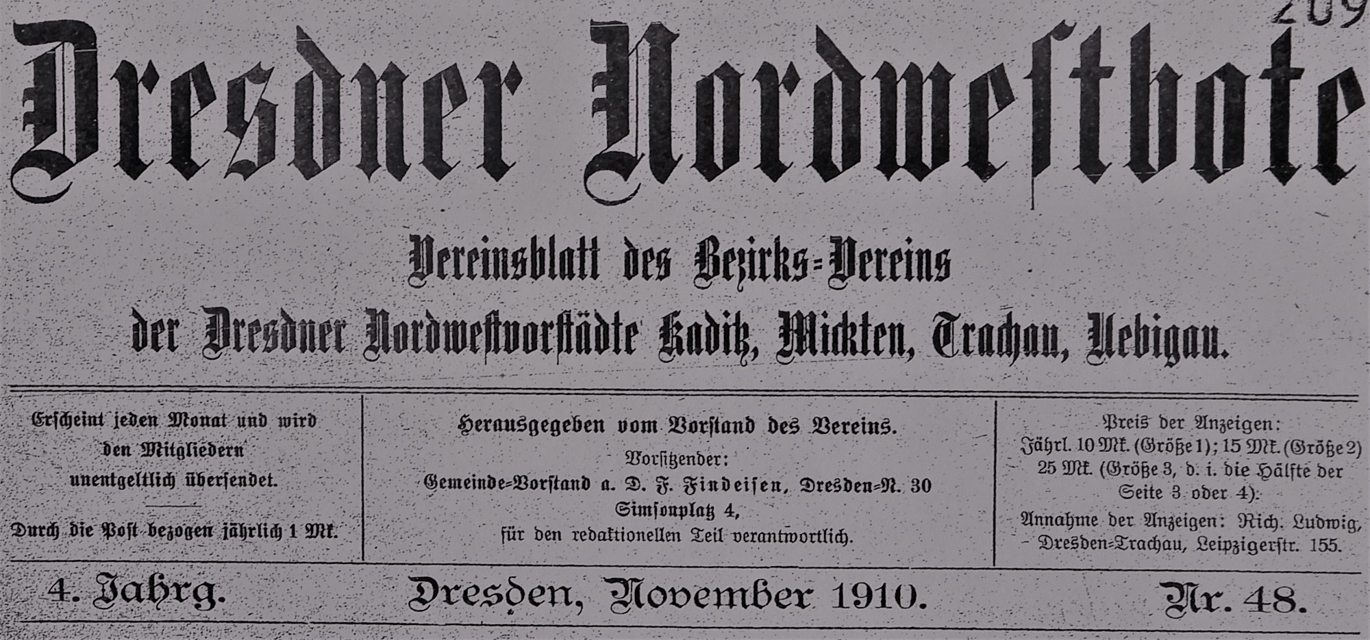 Das Vereinsblatt des 1903 gegründeten „Bezirks-Verein der Dresdner Nordwestvorstädte“, der durch Anzeigen hiesiger Geschäfts- und Ladenbesitzer finanzierte „Dresdner Nordwestbote“, erschien monatlich einmal und war das „Sprachrohr“ des Vorstandes und der fast 130 Mitglieder.