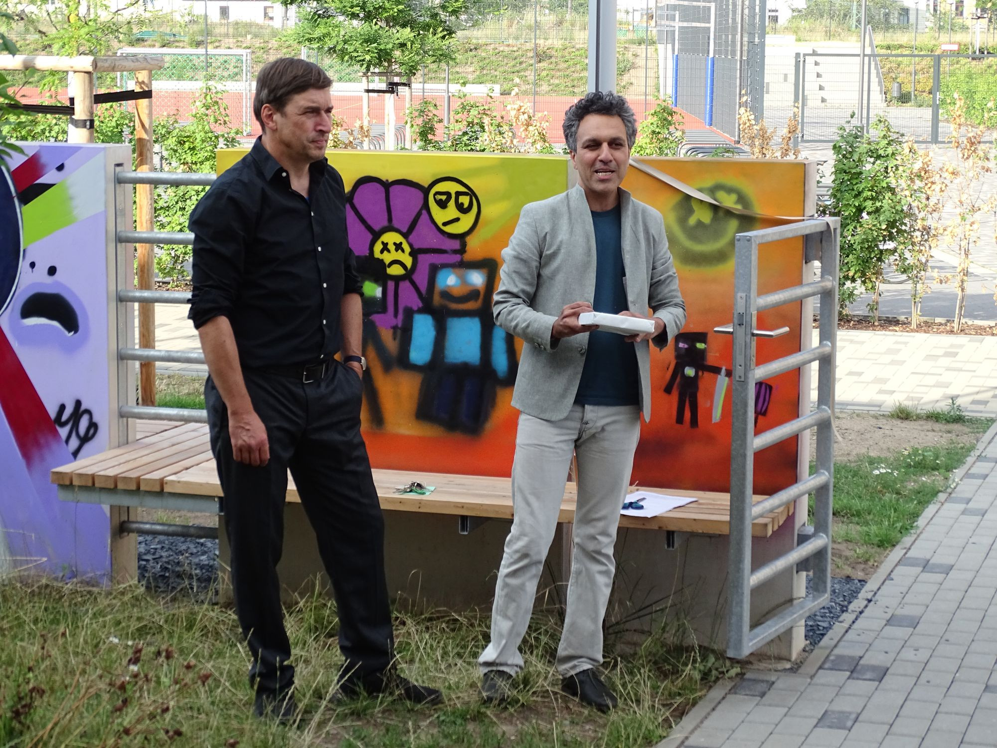 Die Flaggeninstallation stammt von Saeed Foroghi, die Graffitis sind in einem Workshop mit Kindern und Jugendlichen in den vergangenen drei Wochen entstanden. Saeed Foroghi wurde im Iran geboren und hat an der Hochschule für Bildende Künste in Dresden studiert. In seiner Rede erinnerte er am Sonnabend daran, dass es nun 16 Jahre her sei, dass er nach drei vergeblichen Anläufen endlich ein Visum bekam und zur Aufnahmeprüfung an die HfBK fahren durfte. Inzwischen ist er eingebürgert und lebt in Berlin. Der Kunstbeirat des Deutschen Bundestages hat gerade entschieden, eines seiner Kunstwerke anzukaufen. In einer kurzen Rede hat er zur Eröffnung seine künstlerische Intension erläutert.