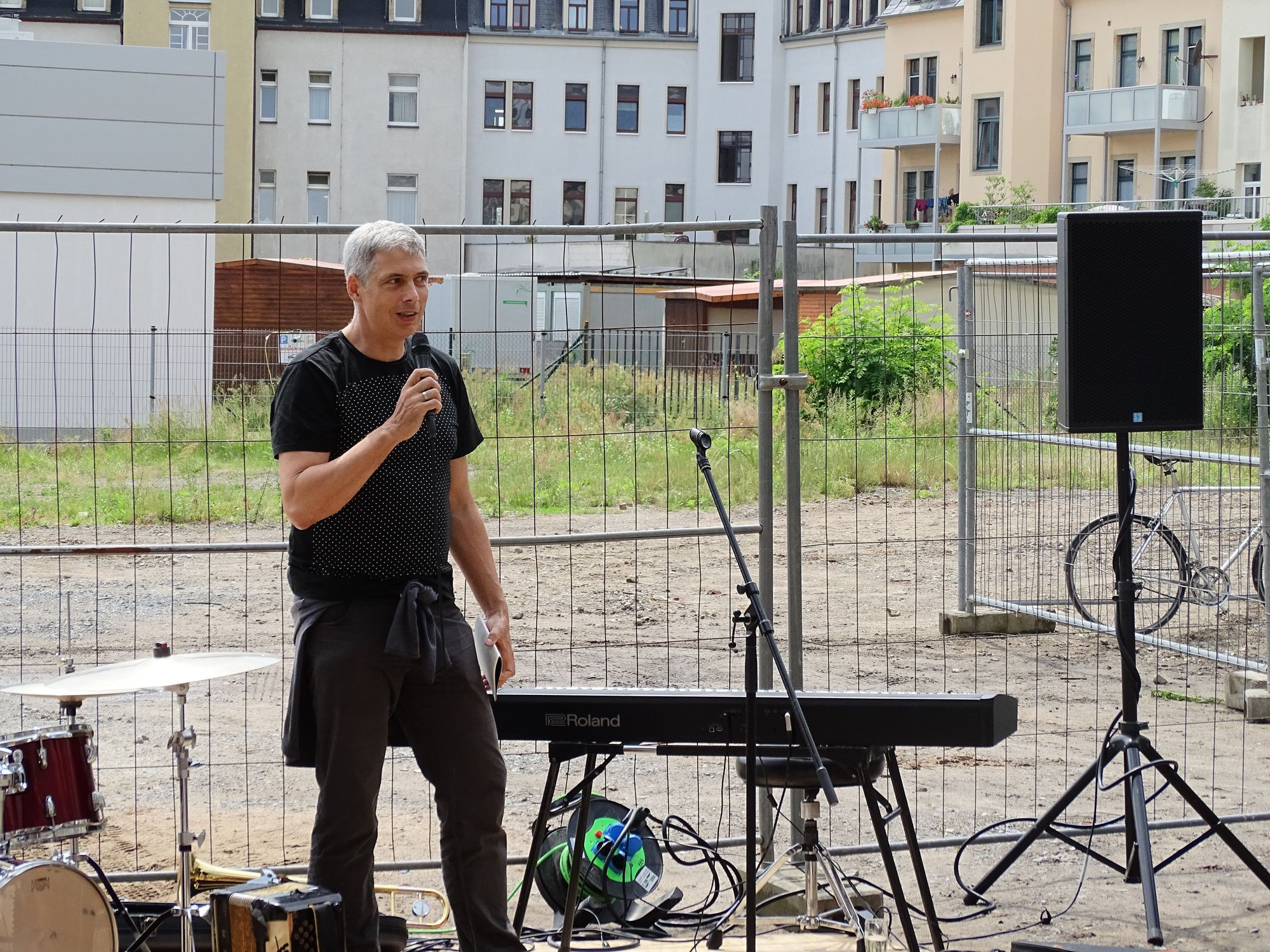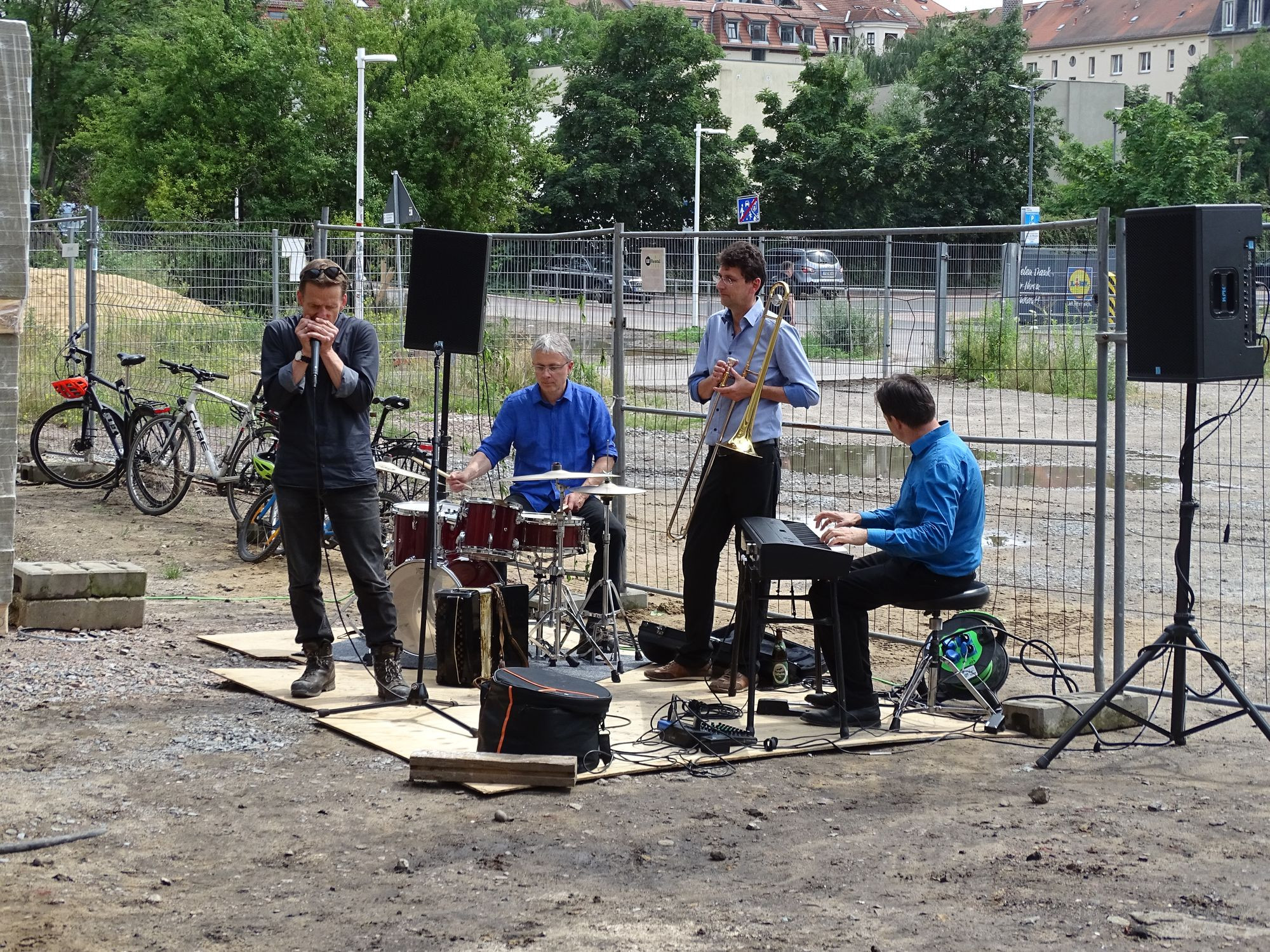 Zum Richtfest gibt es Live-Musik. In der Band „Blue Alley“ sitzt Armin Groß am Schlagzeug. Er kennt die Baustelle bestens, hat als Bauleiter für die Firma Vogel-Bau den Rohbau errichtet. Später wird sich auch noch Carsten Reupke dazugesellen. Er ist als Architekt für die Bauüberwachung durch das Heizhaus-Architekturbüro zuständig. Zum Richtfest gibt er in der Band ein Gastspiel mit Mundharmonika und Saxophon. Ein Zeichen dafür, dass auch die Chemie zwischen Bauleuten und Bauherren stimmt.