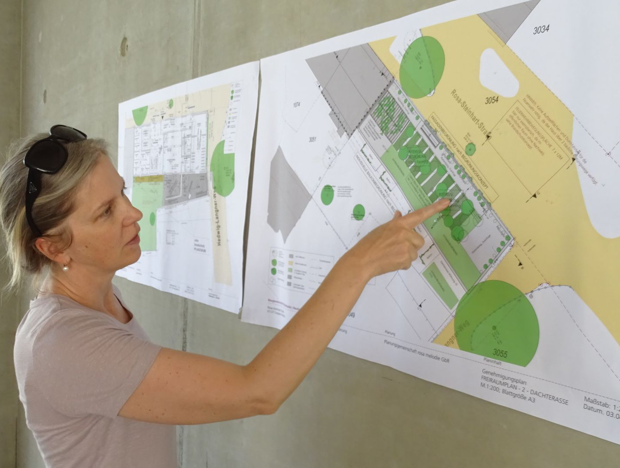 Bauherrin Katrin Vagt erläutert die Gestaltung des Daches – mit Grün für alle Parteien. Foto: W. Schenk