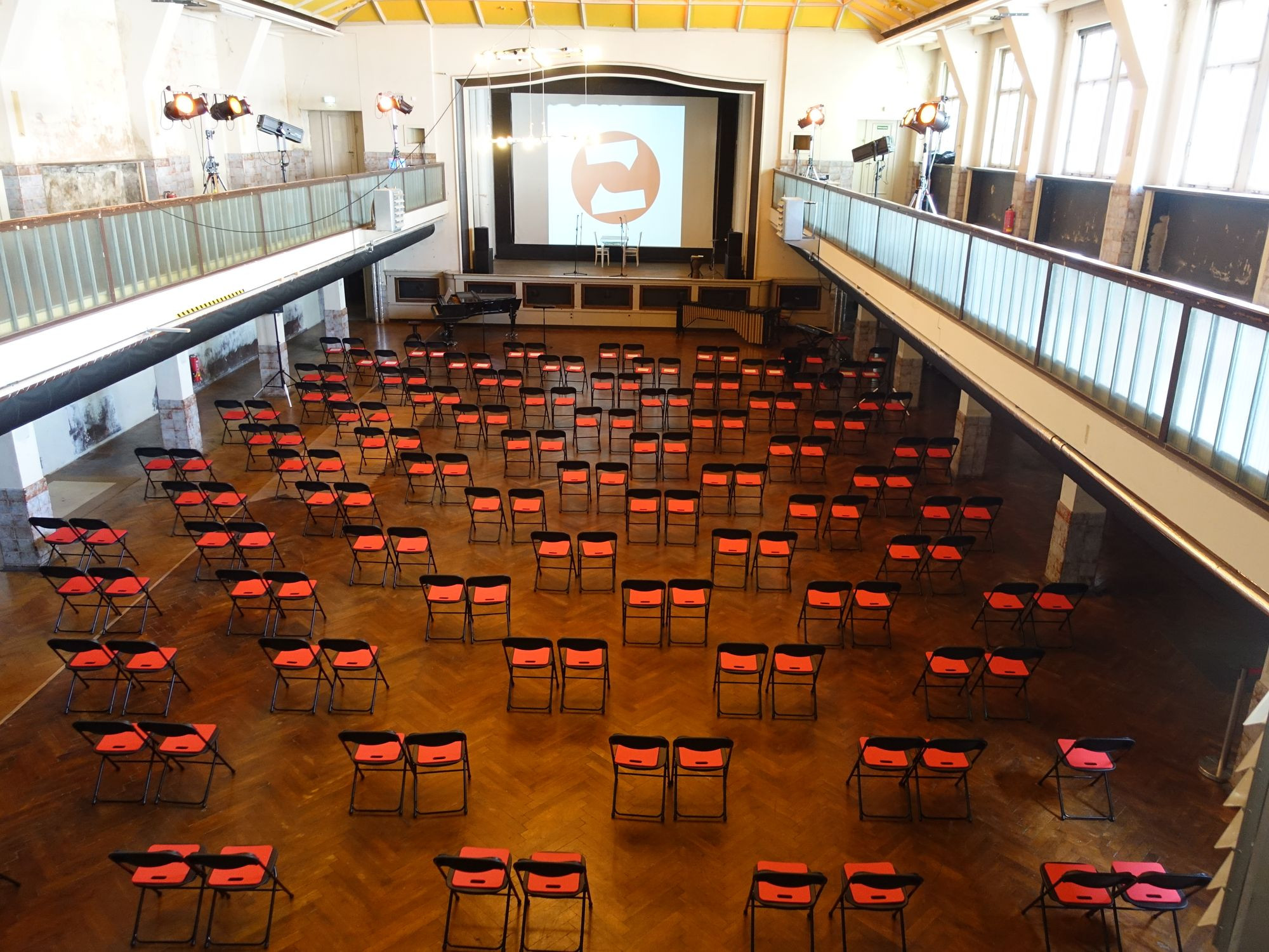Der Ballsaal im Zentralwerk ist am Wochenende offiziell eingeweiht worden. Eine Sektflasche zerschellte zur Feier des Tages an der Außenwand im Hof. Das hat hier Tradition. Im Mai 2017 traf die Sektflasche zielgenau gegenüber auf die Wand des Haupthauses, in dem sich neben Ateliers auch viele der 22 Wohnungen der Zentralwerker befinden. Damals feierte das Zentralwerk seine Eröffnung mit 22 Wohnungen und rund 70 Ateliers. 2018 begannen die Arbeiten im Gemeinschaftshaus, in dem sich neben dem Ballsaal ein kleiner Saal, weitere Ateliers und ein Kabinett befinden.