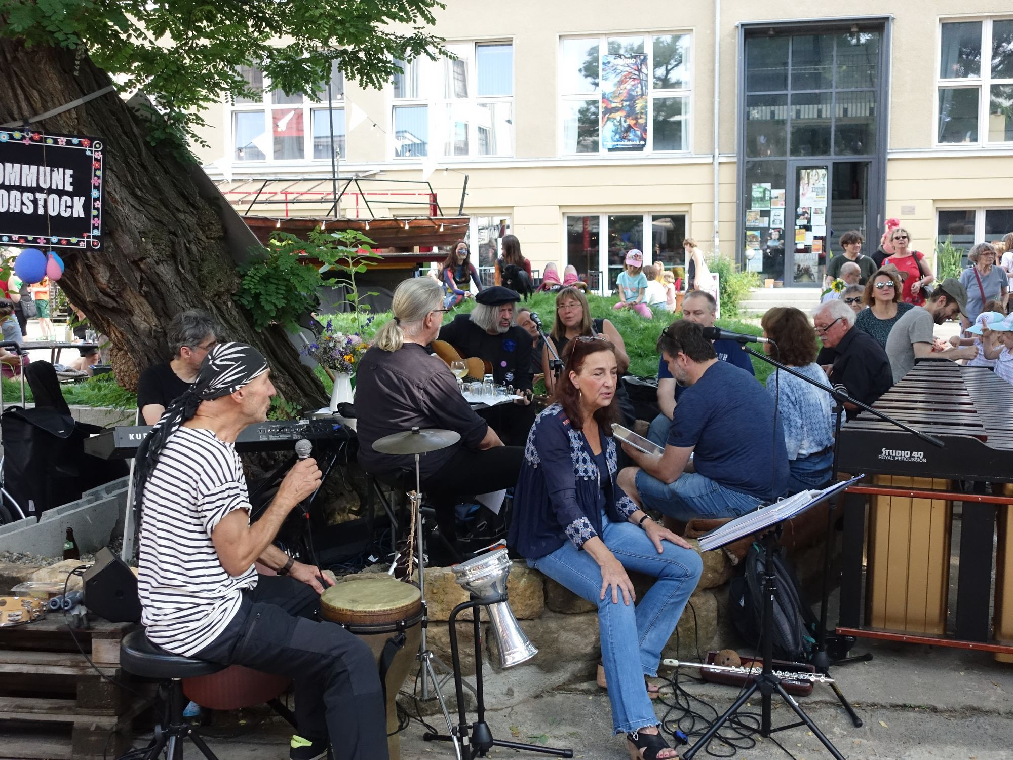 Während Dieter Beckert nach der Feier mit seiner Kommune Woodstock unter der Robinie musiziert, ist Anja Kempe mit der er die Eröffnungsfeier moderierte, mit ihren Raumzonenkostümen im Zentralwerk-Hof unterwegs. Sie gehörte zeitweise zum Vereinsvorstand und wurde 2017 als Professin für Fotografie/Medien an die Hochschule der Bildenden Künste Essen berufen. In der Corona-Zeit habe sie sich viel mit den inneren Eigenwelten beschäftigt und dabei auch Gleichgesinnte gefunden. Verteilt über den Hof findet man verschiedene Ergebnisse dieser Arbeit. Anja Kempe hat sich für Konstruktionen aus Weide entschieden. Man kann in sie hineinschlüpfen. „Da bewegt man sich ganz anders“, führt sie es auch gleich vor und macht sich auf den Weg durchs Publikum.