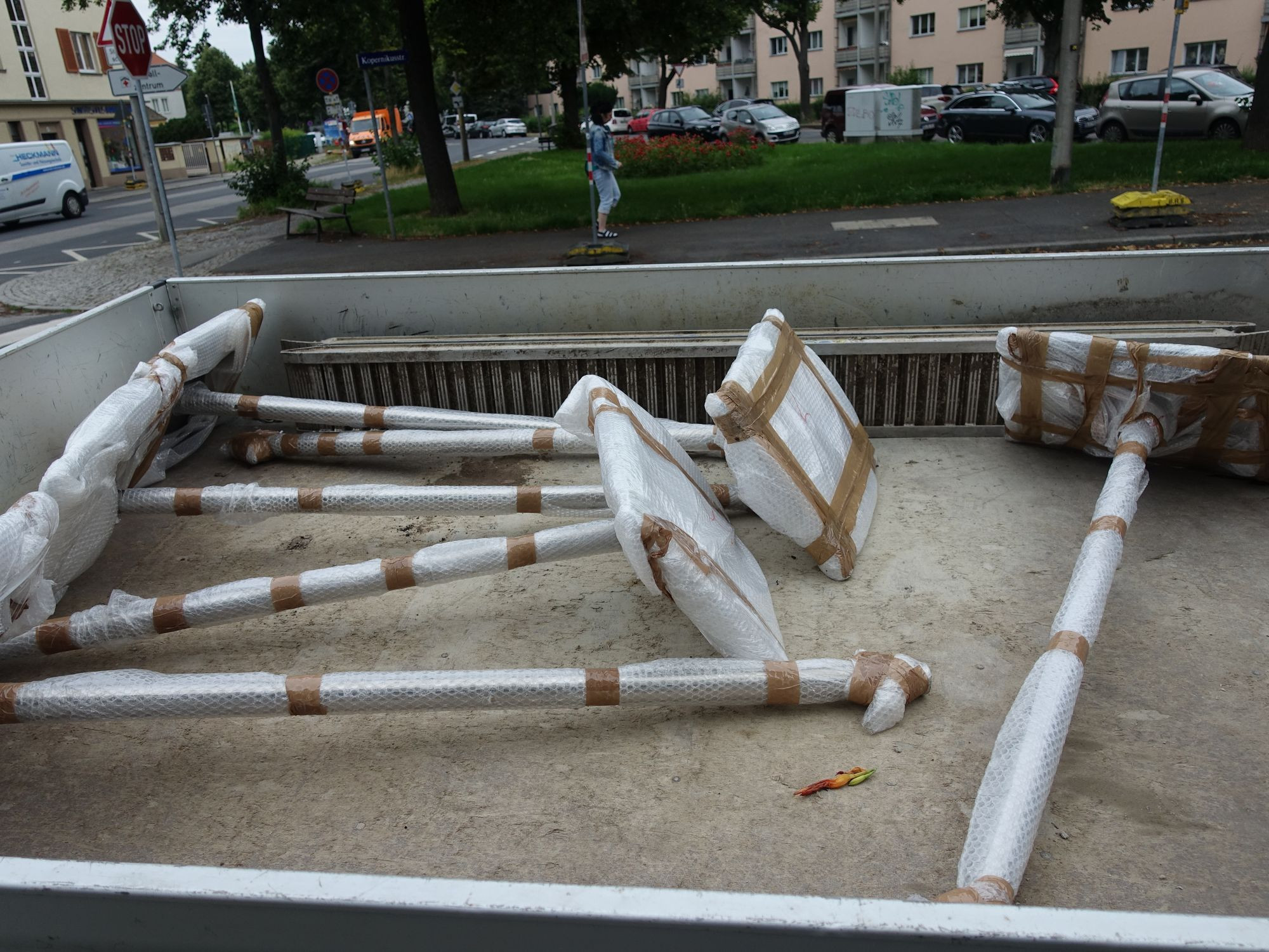 Heute wurden die letzten Tafeln aufgestellt. Marcel Gaudig und René Ehnert von der Firma Daniel Kreher Garten und Landschaft Dresden sind mit den sorgsam verpackten Aufstellern zum Standort an der Ecke Kopernikusstraße / Industriestraße gekommen. Betonmischung, Schippe, Wasserwaage sind notwendig, um dort die Tafel Nr. 1 stabil in die Erde zu bringen.