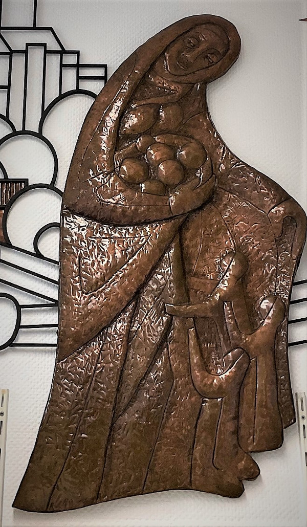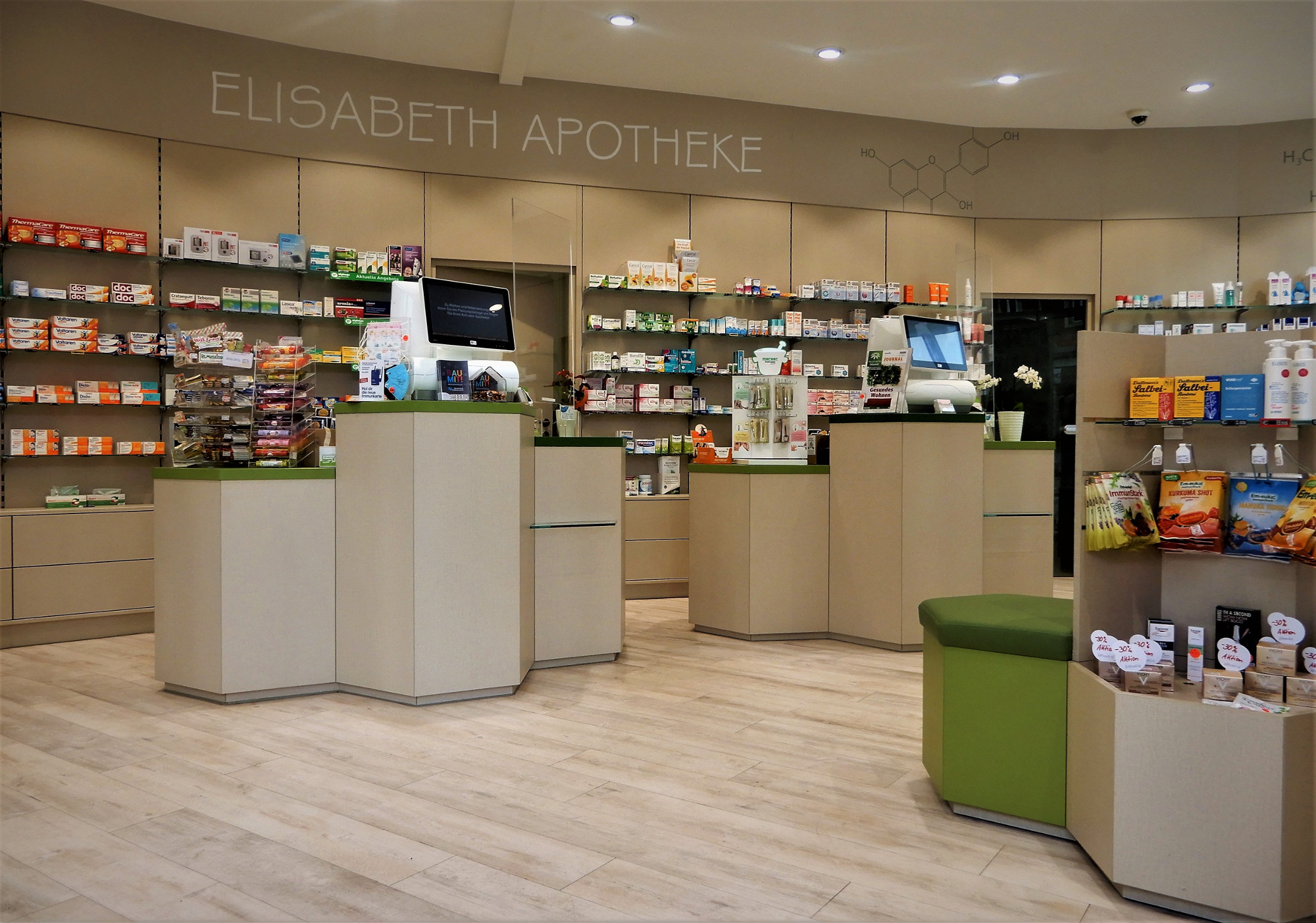 Als Namenspatin entschied sich Dr. phil. Maximilian Heinze für die 1207 als Tochter des ungarischen Königs Andreas II. (1177-1235) geborene und auf der Wartburg aufgewachsene mildtätige Landgräfin Elisabeth von Thüringen. Als „Heilige Elisabeth“ in die Geschichte eingegangen, legte sie 1229 als Franziskanerin die Gelübde der Armut, Demut und Weltentsagung ab und widmete sich fortan der Krankenpflege. Nur vier Jahre nach ihrem Tode, sie starb am 17. November 1231 in Marburg, wurde sie durch den Papst der katholischen Kirche heiliggesprochen. Bis heute ist die „Heilige Elisabeth“ Patronin von Thüringen und Hessen und gilt auch als Beschützerin von Witwen und Waisen, Bettlern, Kranken und unschuldig Verfolgten. Das in der Apotheke eine Wand schmückende Kupferrelief „Leben der Heiligen Elisabeth und die Bedeutung der Pharmazie“ schuf der Dresdner Künstler Alfons Garn (1926-2005).