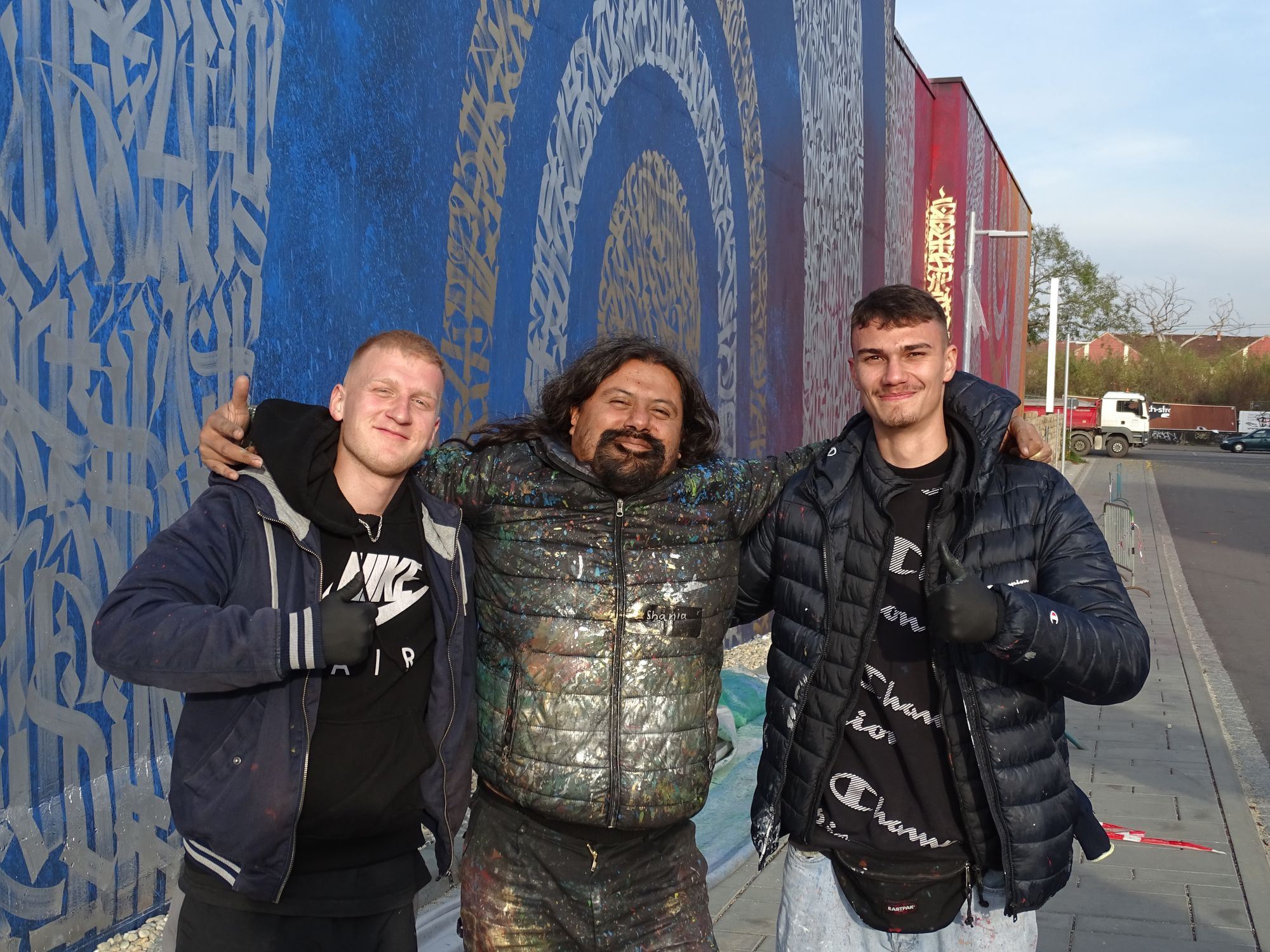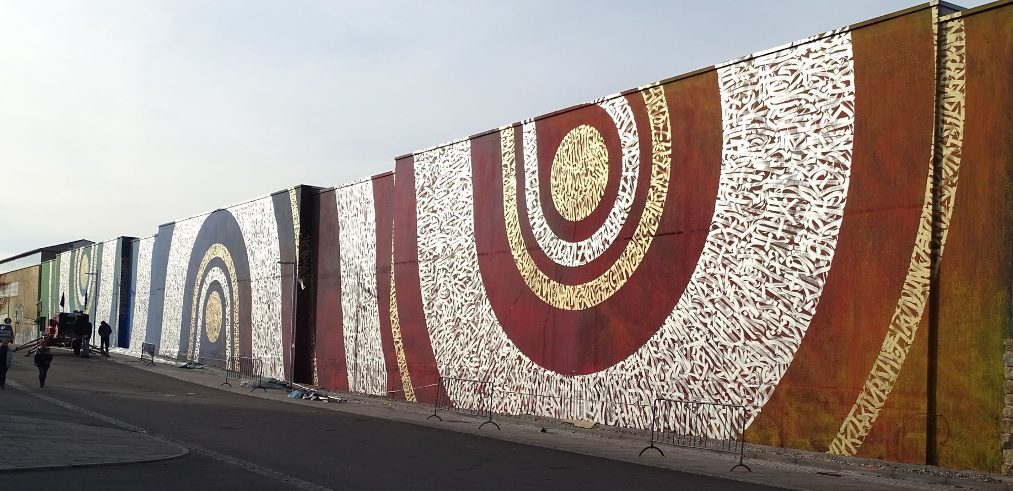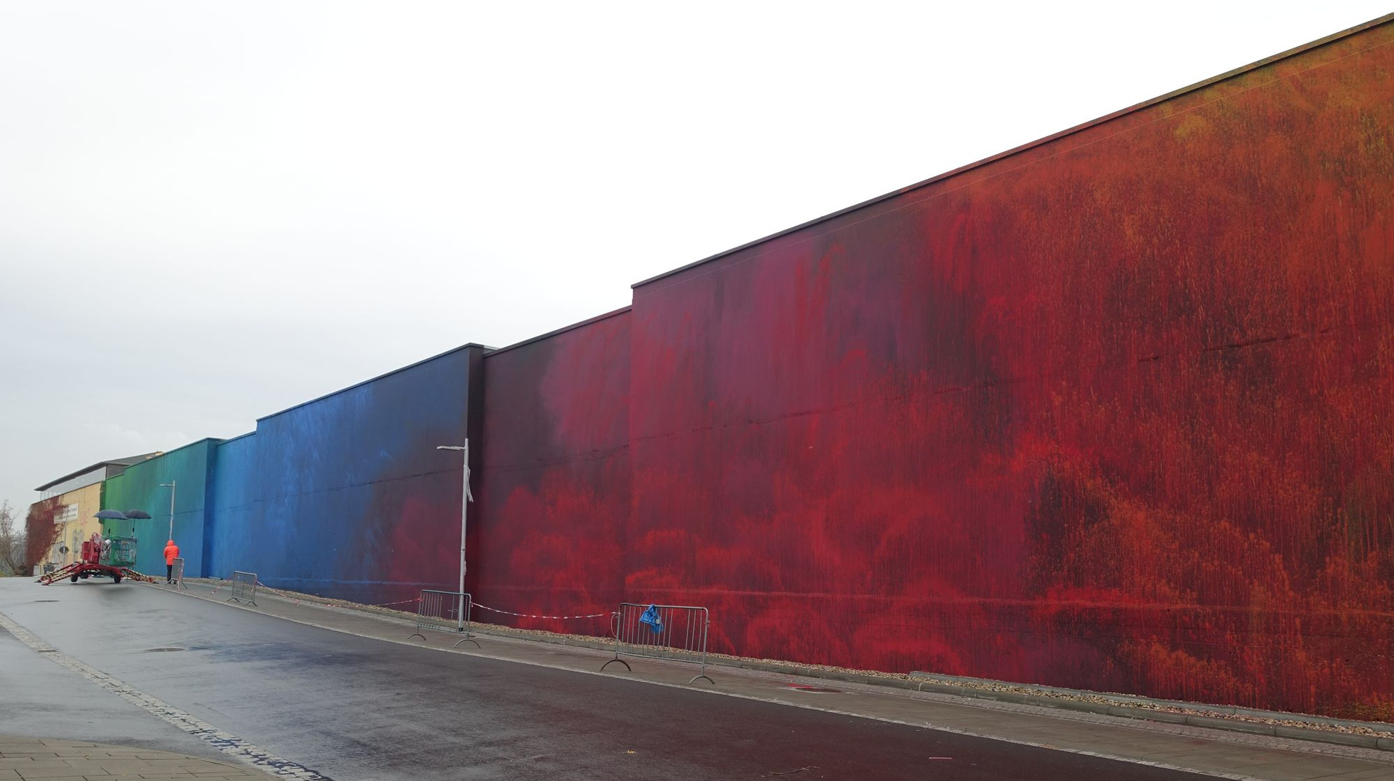 Tolle Aktion! Damit wird dieser bauliche Frevel (eine 7 Meter hohe Mauer als Lärmschutz für eine bereits vor Bebauung bestehende ‚Feierlocation‘) zumindest optisch ungemein aufgewertet.