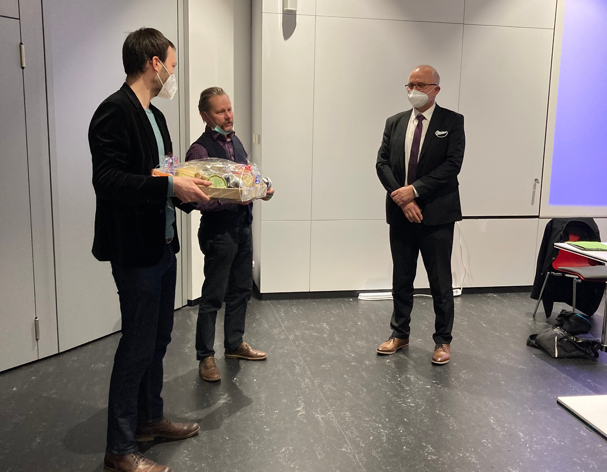 So richtig verabschieden konnte sich Wintrich nicht von seinen Stadtbezirksbeiräten. Die Dezembersitzung wurde aufgrund der Corona-Notfallverordnung abgesagt. Glück war, dass der Stadtbezirksbeirat Klotzsche noch einige unaufschiebbare Entscheidungen treffen musste. So machten sich acht der 19 Beiräte am 6. Dezember auf den Weg in den Sitzungssaal im Flughafen Klotzsche, wo Wintrich seine letzte von insgesamt rund zweihundert Stadtbezirksbeiratssitzungen leitete. Im Namen der Pieschener Beiräte übergaben Uwe Sochor und Raphael Grübler einen Präsentkorb als Dankeschön. Danach gab es Sekt und Häppchen und Musik.